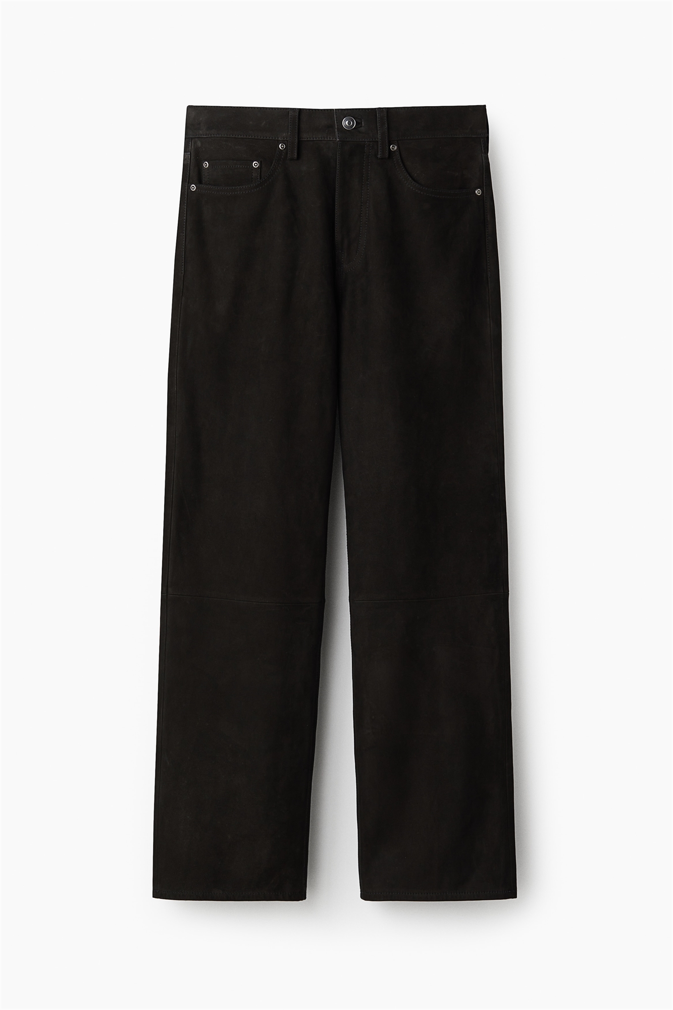 H&M Atelier. Брюки с 5 карманами из мягкого нубука, свободный крой от сиденья до подола, опущенная промежность и дополнительное пространство по всей ноге. Видимый шов под коленями, обычная талия и застежка на молнию. Частично на подкладке.
