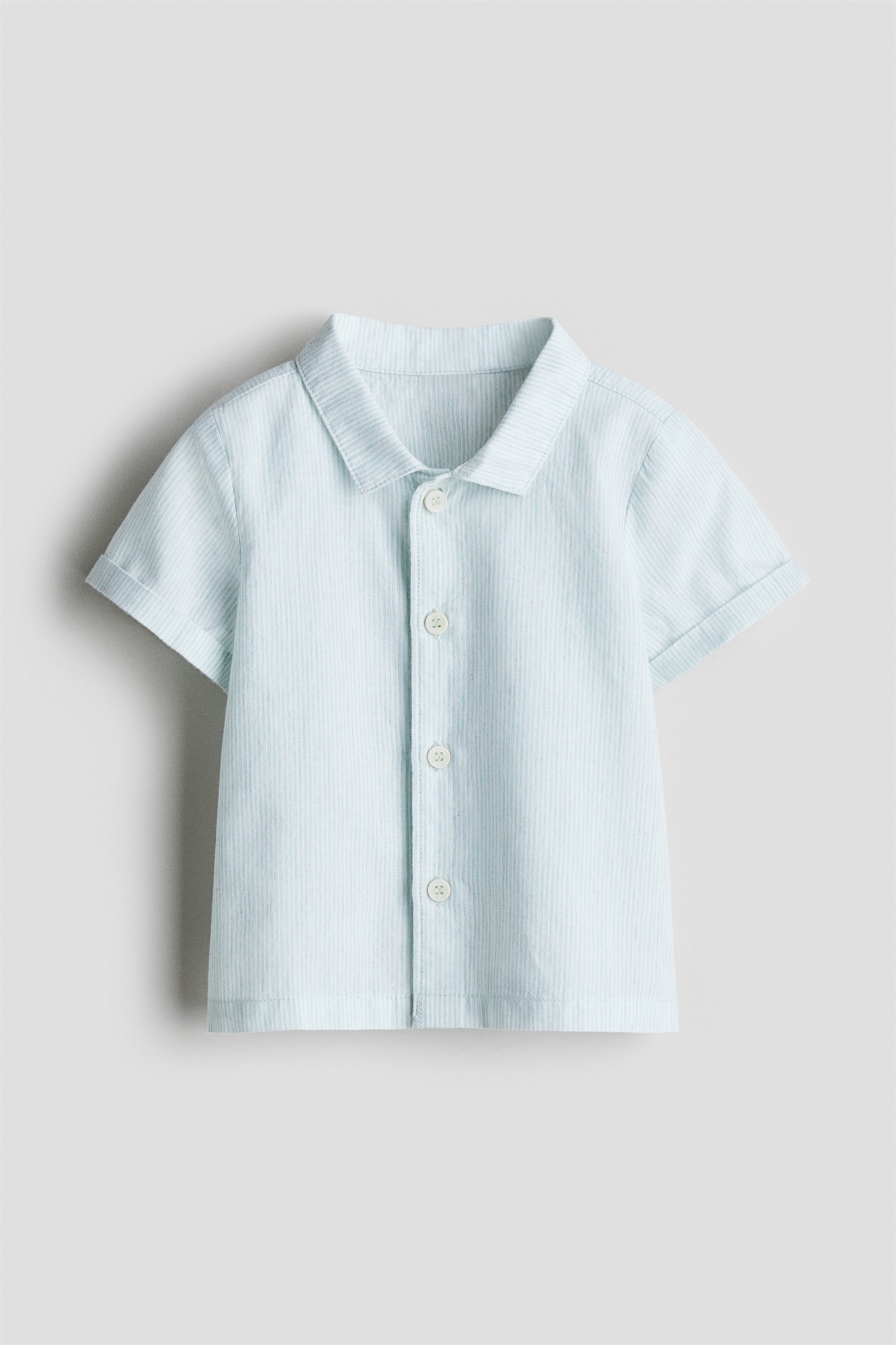 Рубашка с короткими рукавами из воздушного хлопкового полотна с отложным воротником и пуговицами спереди. Слегка удлиненная сзади и прямой подол.