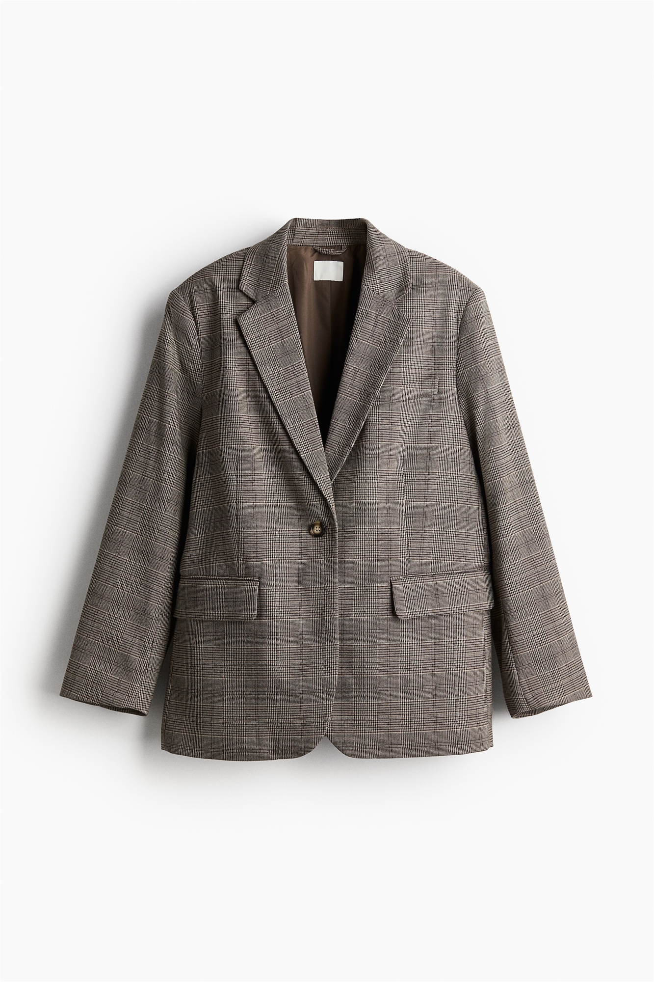 Свободный однобортный блейзер из тканого материала с лацканами с вырезом и застежкой на пуговицу спереди. Накладки на плечах, накладной карман на груди и втачные передние карманы с клапаном. На подкладке.