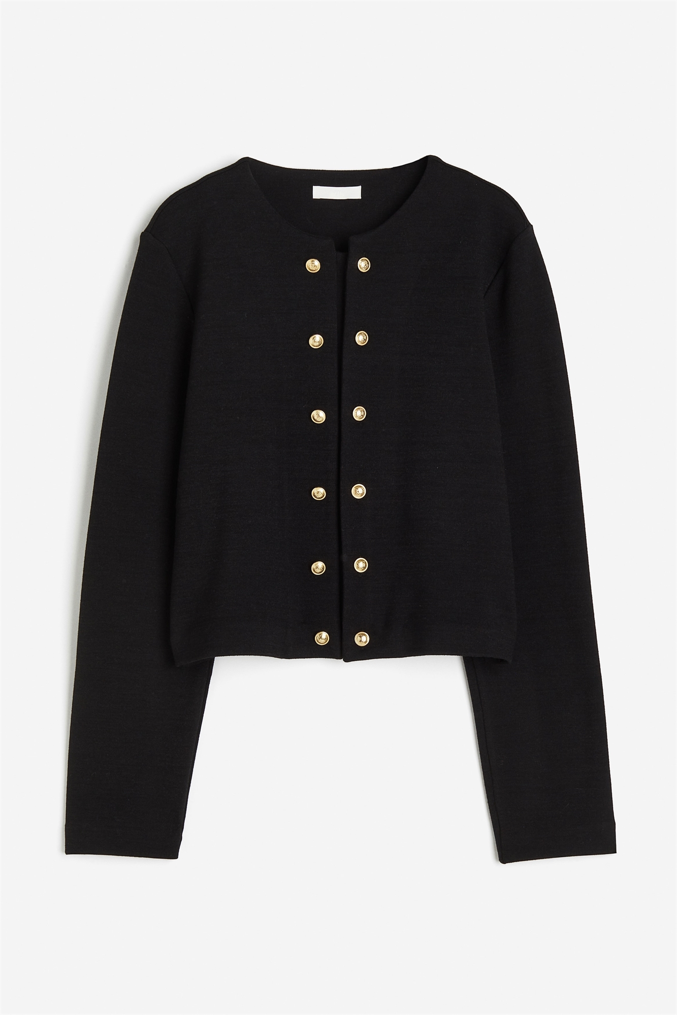 Кардиган из прочного джерси с круглым вырезом, длинными рукавами и двойным рядом пуговиц, одна функциональная, другая декоративная.