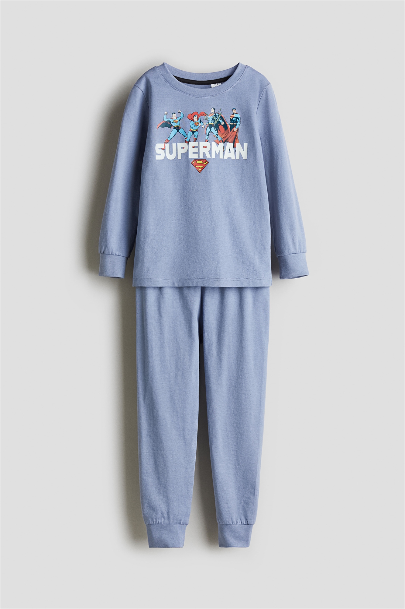 Пижама с верхом и низом из мягкого хлопкового джерси с принтом. Верхняя часть с длинными рукавами и окантовкой по вырезу горловины и манжетам. Нижние штанишки с мягкой эластичной вставкой на талии и ребристыми краями.