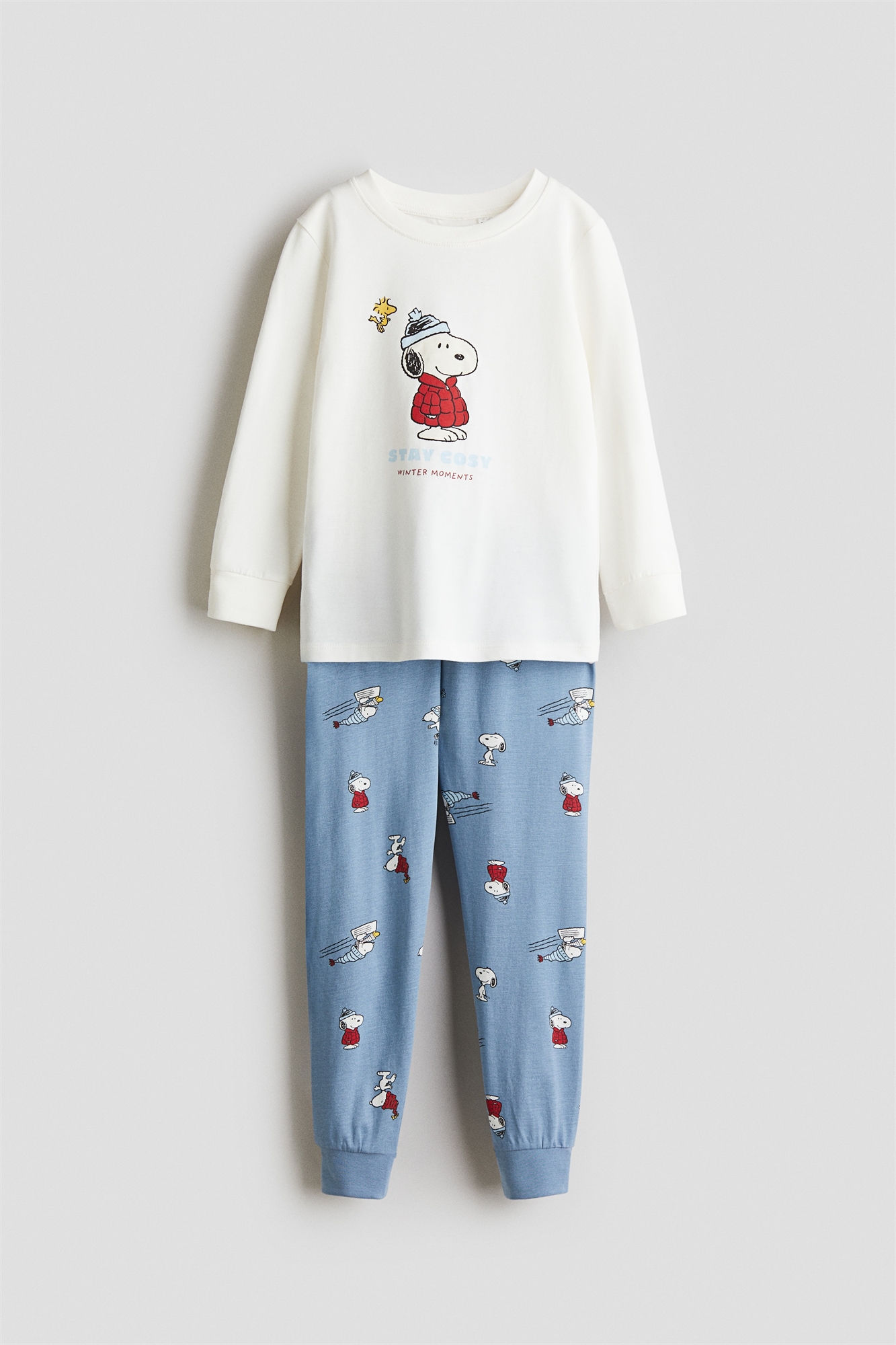 Пижама с верхом и низом из мягкого хлопкового джерси с принтом. Верхняя часть с длинными рукавами и окантовкой по вырезу горловины и манжетам. Нижние штанишки с мягкой эластичной вставкой на талии и ребристыми краями.