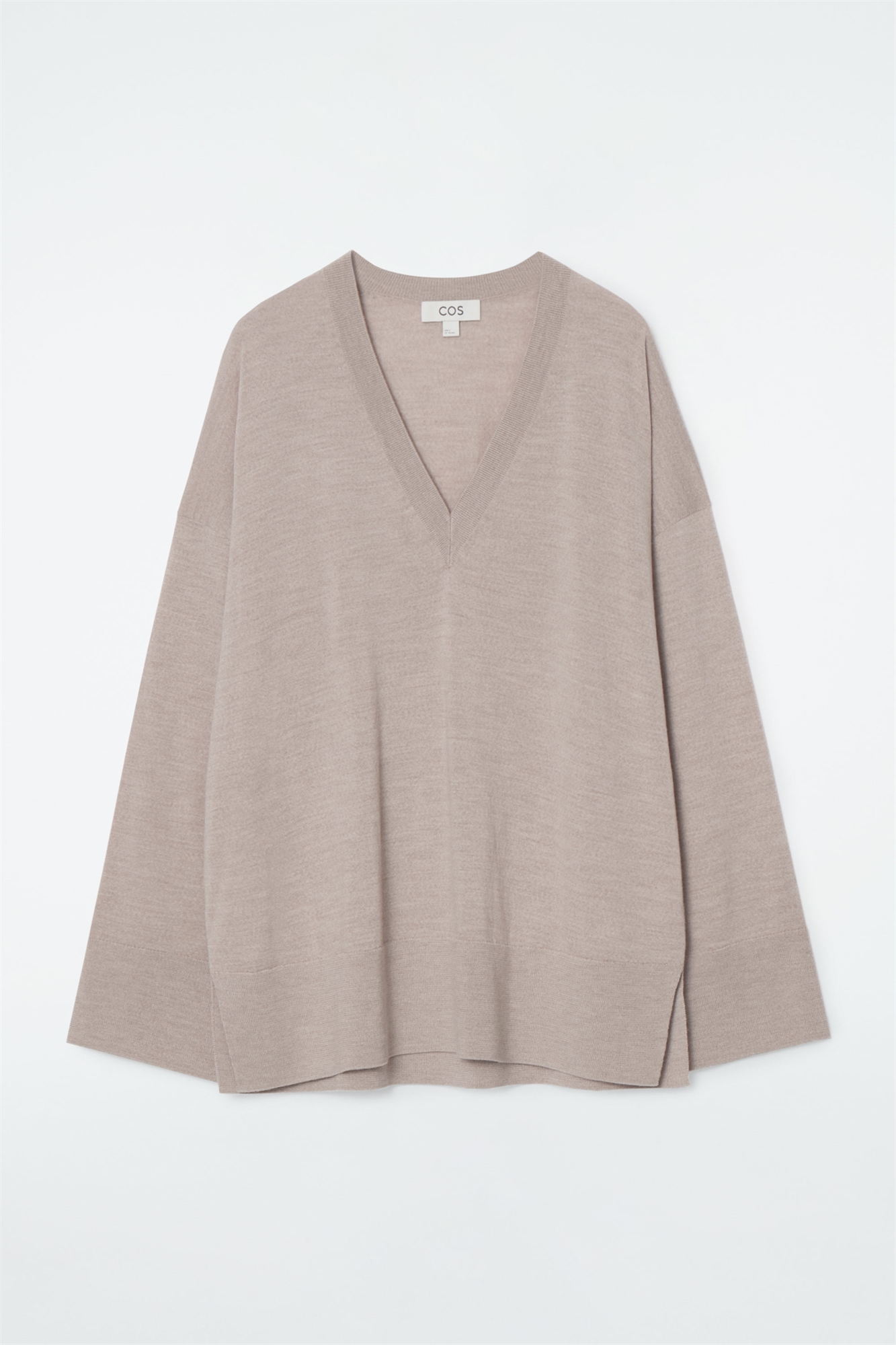 Этот современный джемпер из высококачественной мериносовой шерсти одновременно удобен и изыскан. Он выполнен в простом бежевом цвете и имеет V-образный вырез, боковые разрезы и свободный силуэт. Дополните образ подходящими к нему кюлотами. Свободный крой Ребристая отделка Эта вещь сертифицирована в соответствии со стандартом ответственной шерсти TE-00047206 (RWS) и содержит шерстяные волокна с ферм, сертифицированных в соответствии с правилами благополучия животных и сельского хозяйства Внешний материал: 100% мериносовая шерсть. Детали исключены/Машинная стирка Длина по спине в размере S = 71 см/Модель носит размер S