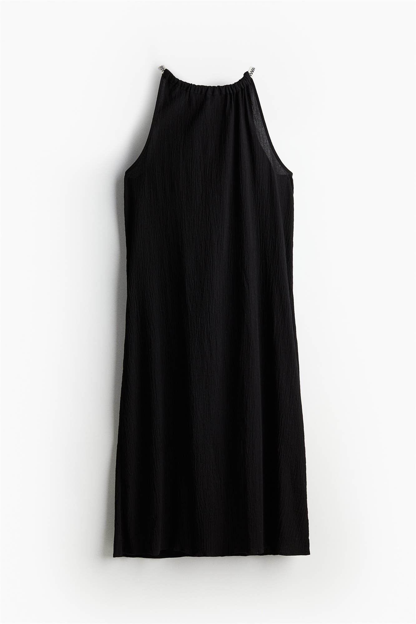 Платье без рукавов длиной до середины бедра из хлопкового полотна с кринклиновым плетением и силуэтом A-line. Свободный крой с узким разрезом в верхней части и вырезом с завязками, которые завязываются сзади на шее. Без подкладки.