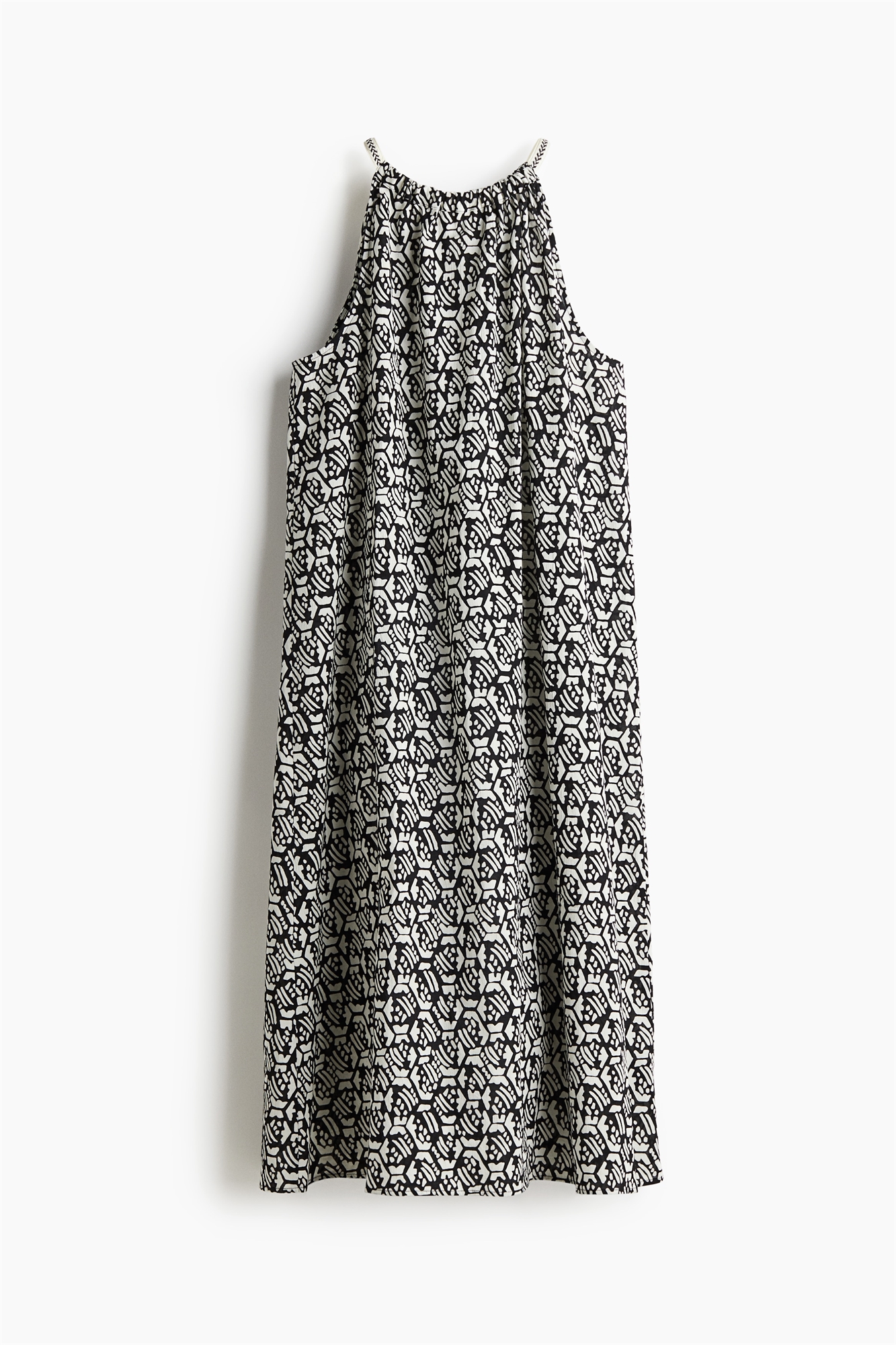 Платье без рукавов длиной до середины бедра из хлопкового полотна с кринклиновым плетением и силуэтом A-line. Свободный крой с узким разрезом в верхней части и вырезом с завязками, которые завязываются сзади на шее. Без подкладки.