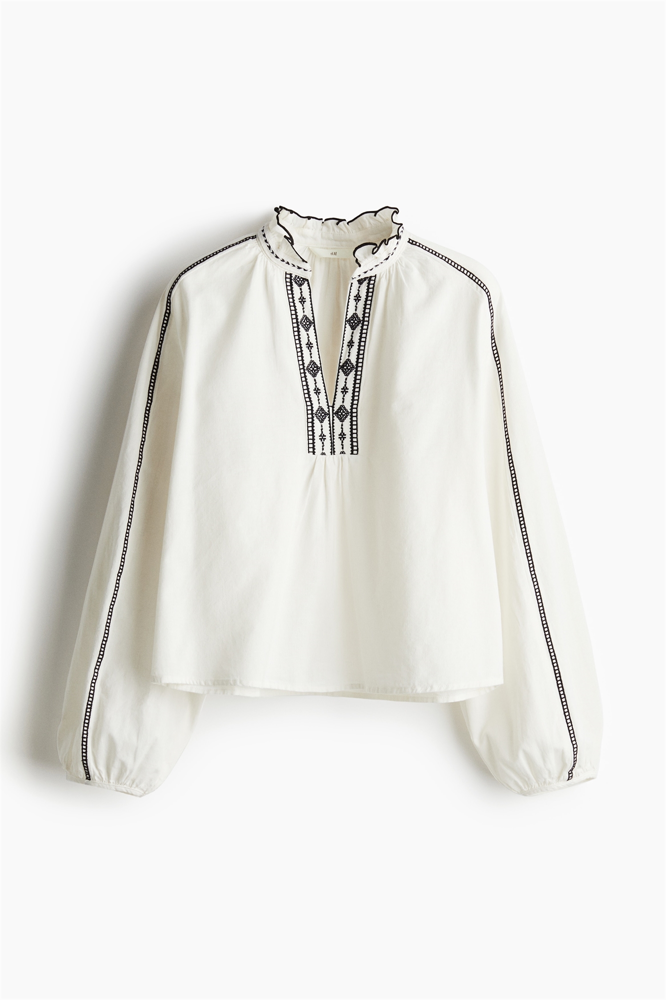 Блузка из воздушного льна и хлопка с отделкой акцентного цвета. Свободный крой с небольшим воротником с оборками и V-образной проймой спереди. Спущенные плечи и длинные рукава-баллон с узкими манжетами.