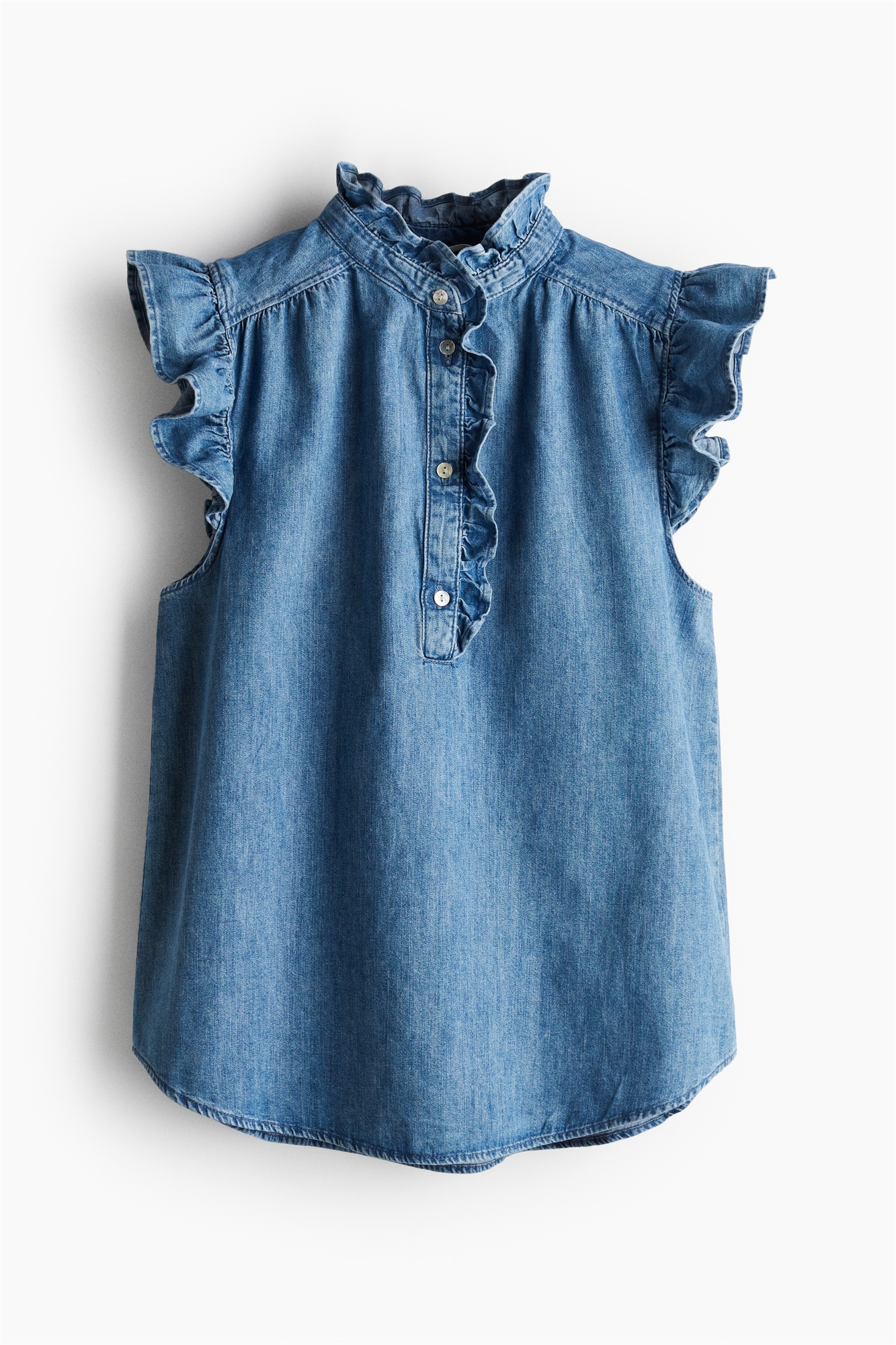 Блузка из мягкого хлопкового денима с воланом на воротнике и пуговицей с отделкой воланом. Рукава с воланами и ярмо со сборчатыми швами спереди на плечах и сзади. Закругленный подол.