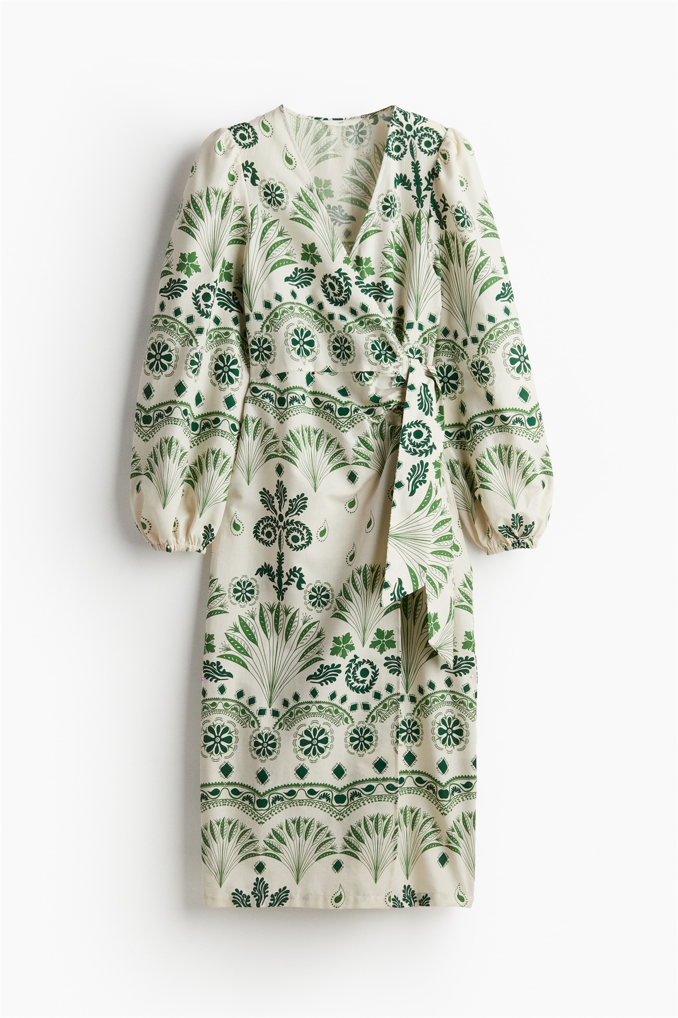 Платье длиной до колена из хлопкового полотна с V-образным вырезом горловины и облегающим передом с широкими завязками с одной стороны. Длинные рукава-баллоны с узкими эластичными манжетами. Без подкладки.