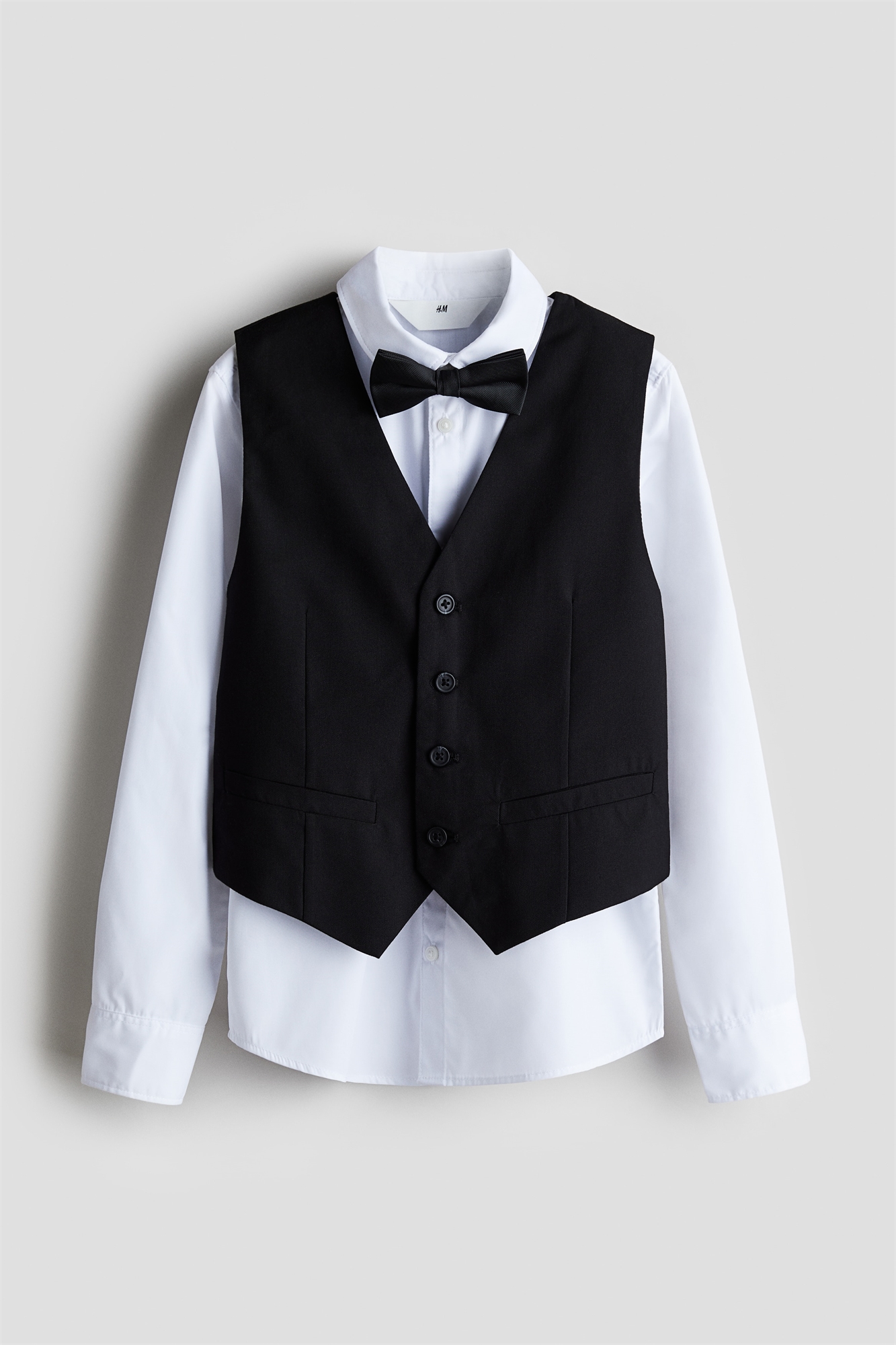 Нарядный комплект из поплиновой рубашки, саржевого жилета и галстука-бабочки. Рубашка с воротником, застегивающимся спереди на пуговицы, длинными рукавами с манжетами на пуговицах и рукавной планкой с пуговицей-звеном. Жилет на подкладке с пуговицами спереди и накладными карманами. Галстук-бабочка с регулируемым эластичным ремешком и пластиковой застежкой сзади.