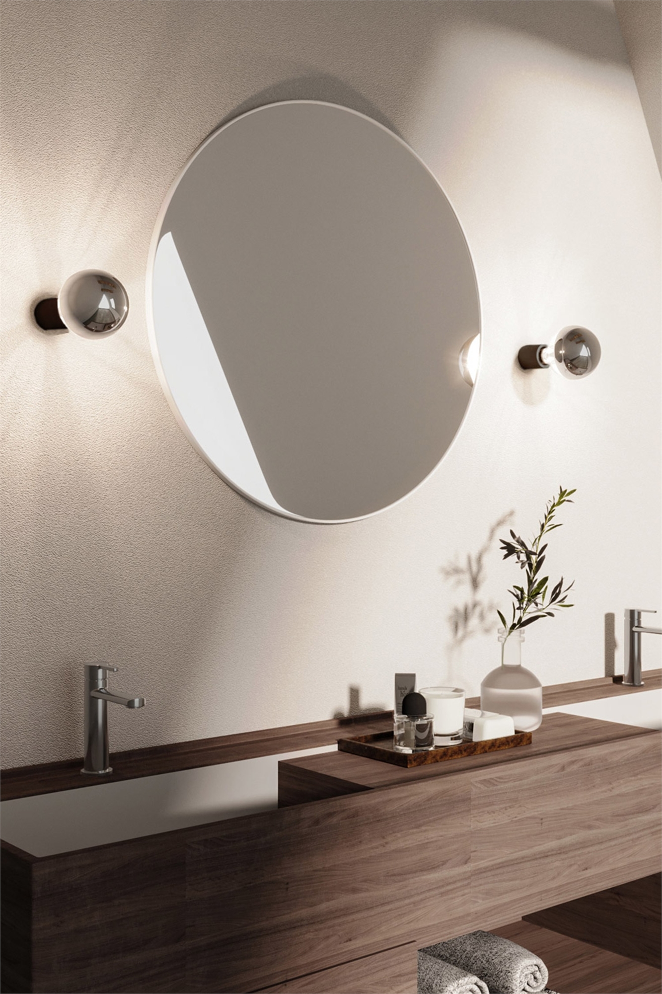 Комплект из 2 минималистичных светильников для настенного или потолочного монтажа. Цоколь E27 с защитой IP44. В комплект входят лампочки с отражающей головкой серебристого цвета, 7W 750Lm. Диаметр патрона лампы: 5 см, высота: 6 см. Общая длина около 21 см.