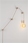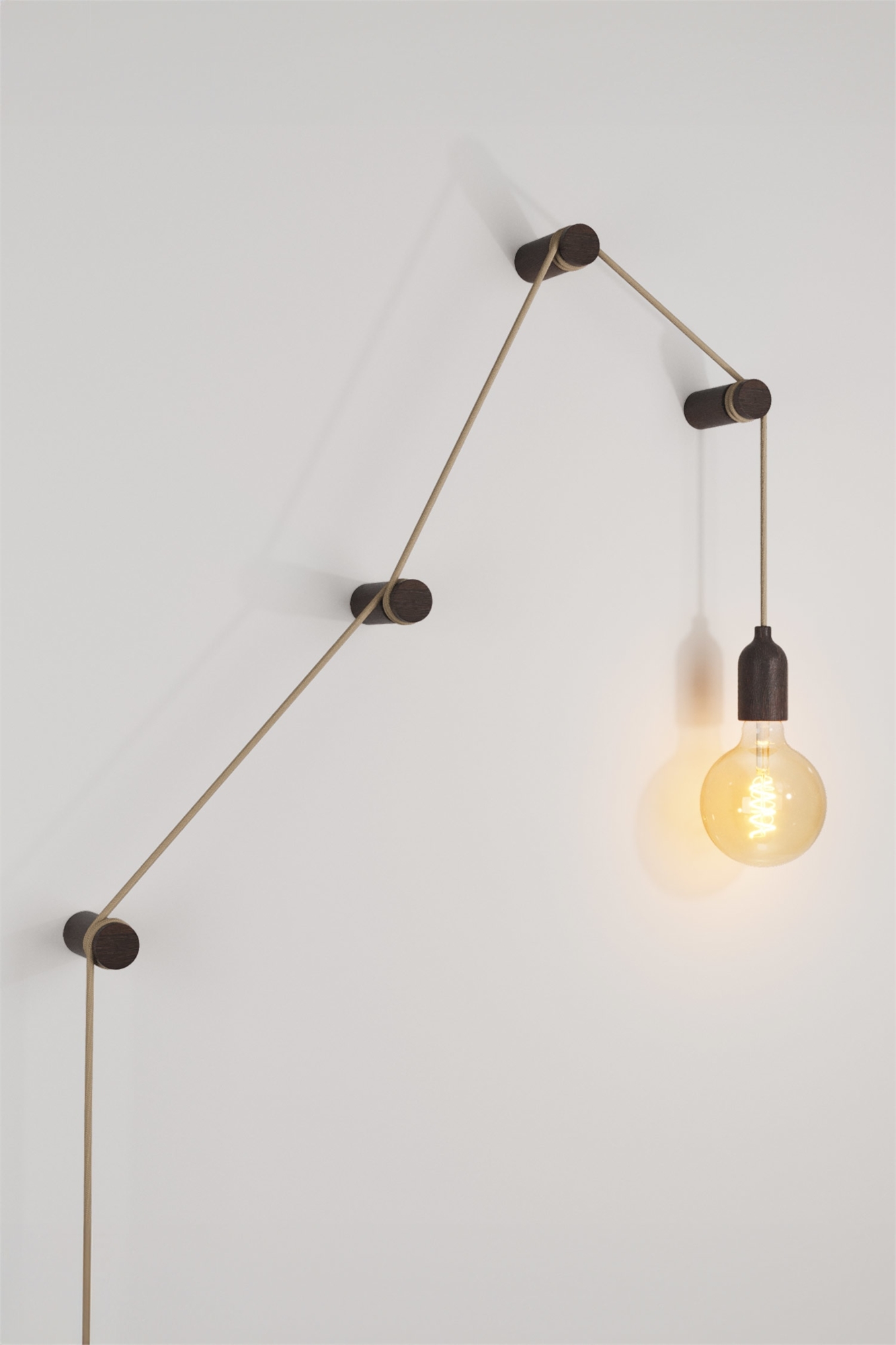 Портативный, модульный и настраиваемый настенный светильник. Можно собирать для создания индивидуальных световых решений. Деревянный держатель лампы с эффектом венге. Кабель в джутовой оболочке. 4 деревянных настенных и потолочных штыря с эффектом венге. Прозрачная вилка. В комплекте лампочка золотого цвета, 4W 250Lm. Длина кабеля 500 см.