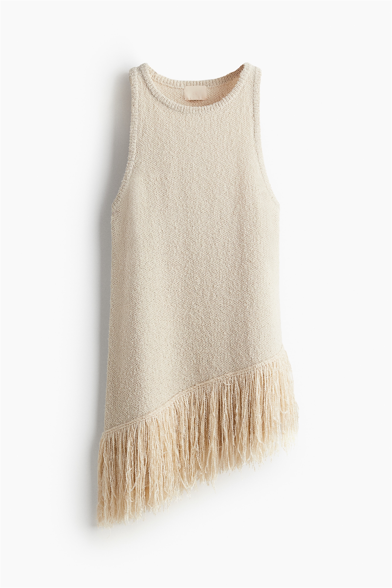 Длинный жилет из мягкого трикотажа букле с круглым вырезом и диагональным подолом с бахромой. Узкая тесьма по вырезу горловины и проймам.