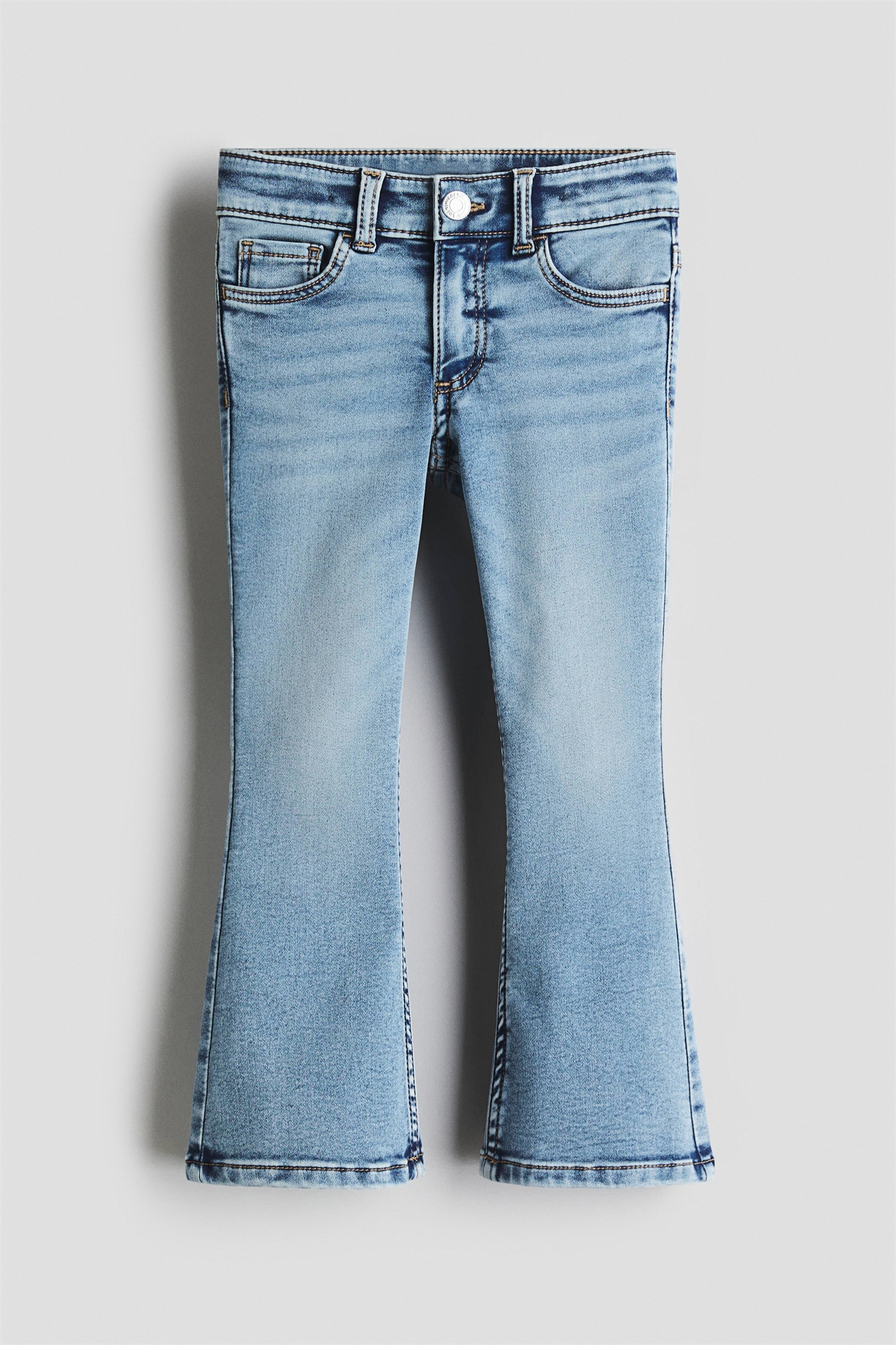 Джинсы с 5 карманами из эластичного хлопкового денима. Зауженный крой по бедрам и бедрам с расклешенными ногами. Регулируемый эластичный пояс и ширинка на молнии с кнопкой.