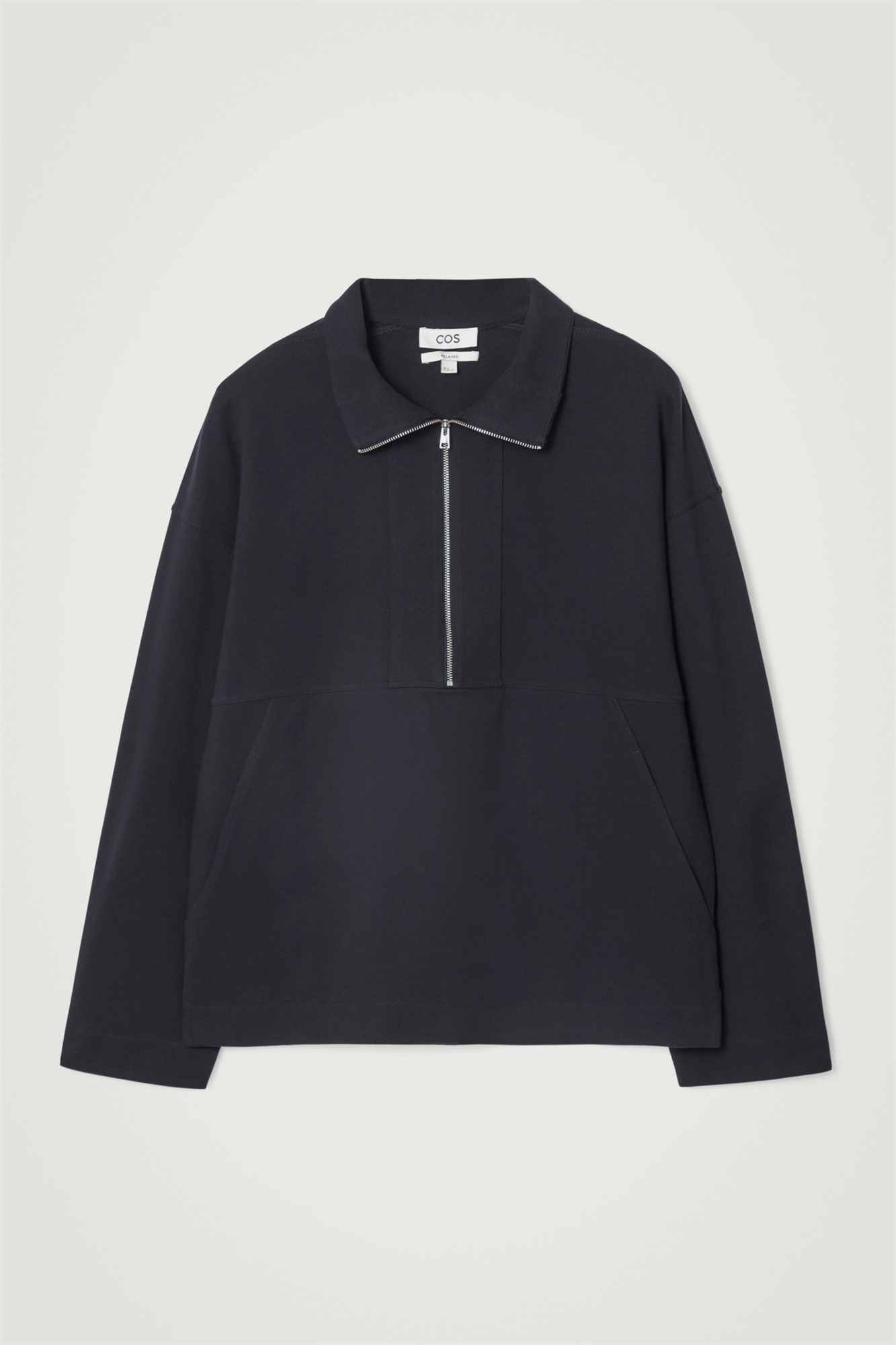 Эта толстовка темно-синего цвета сочетает в себе комфорт одежды для отдыха и элементы рабочей одежды. Она пошита из хлопково-твиллового джерси в непринужденной форме, имеет заостренный воротник, манжеты с застежками и большой карман, что указывает на ее утилитарные корни. Носите ее с соответствующими шортами. Свободный крой Застежка-молния Ткань: 97% хлопок, 3% эластан. Без учета отделки / Машинная стирка Длина по спинке для размера M составляет 66,9 см / Модель носит размер M