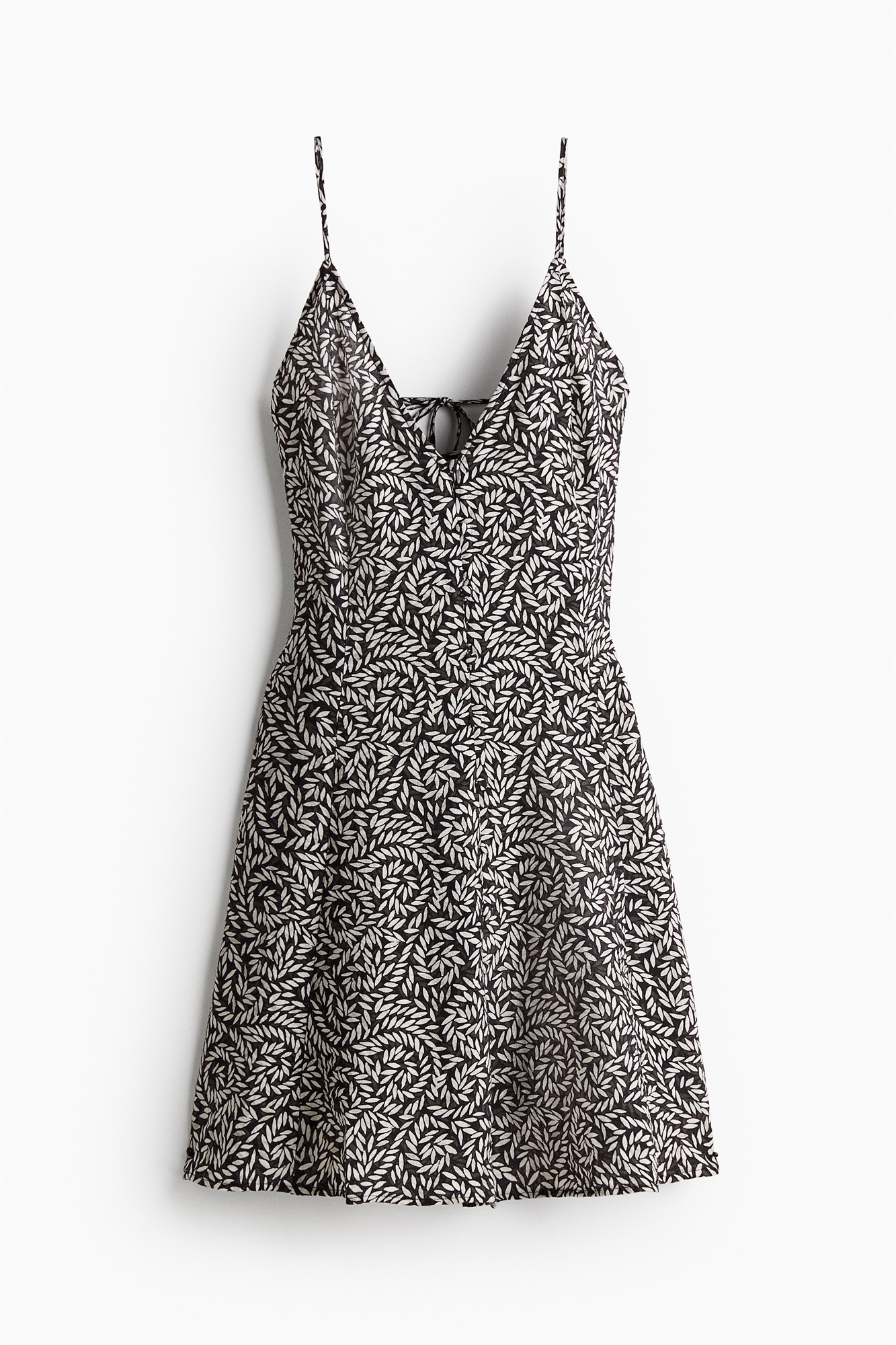 Короткое платье А-линии из воздушной ткани с глубоким V-образным вырезом и закрытыми пуговицами спереди. Узкие регулируемые бретели и горизонтальные завязки сзади. Без подкладки.