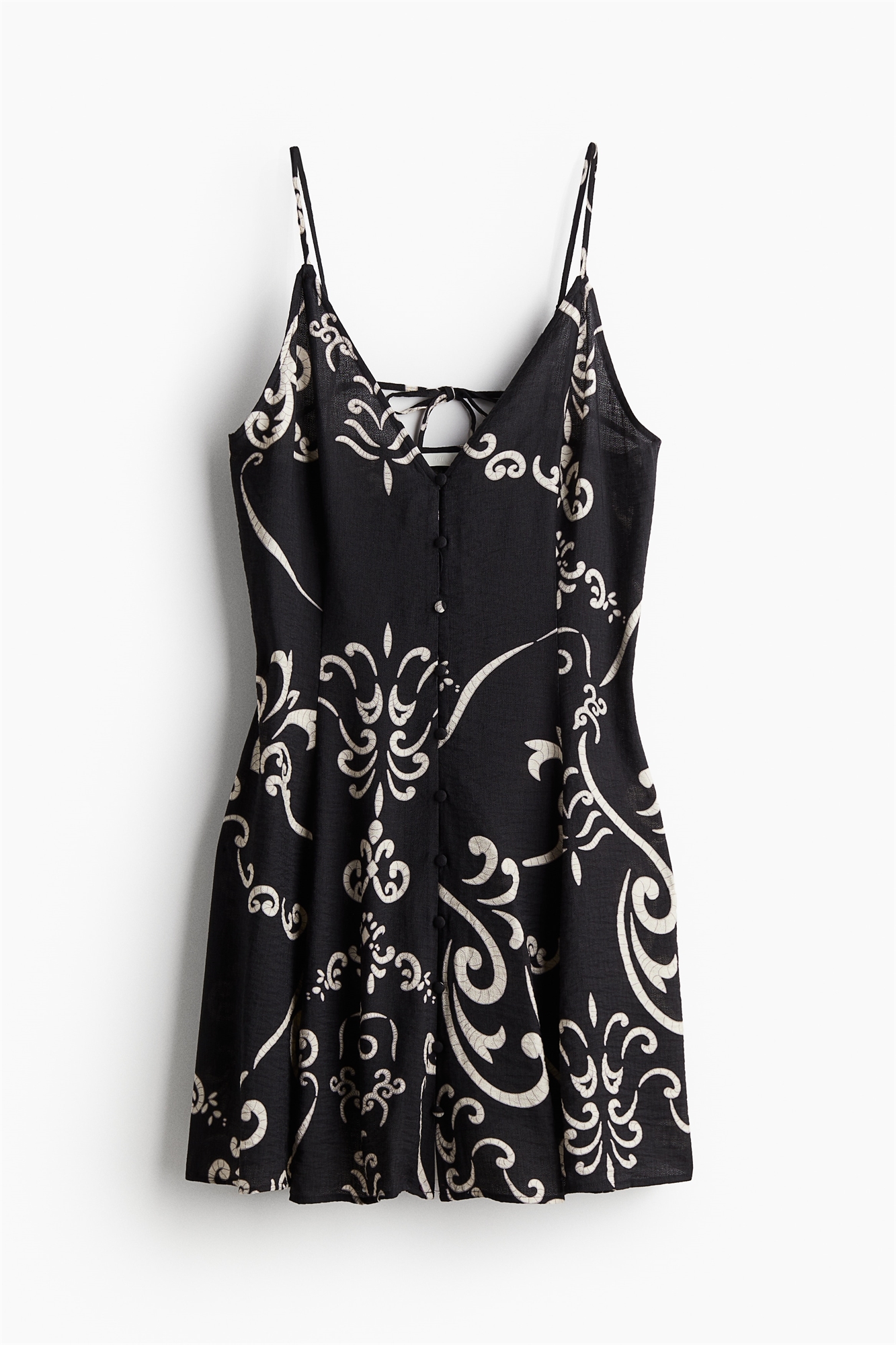 Короткое платье А-линии из воздушной ткани с глубоким V-образным вырезом и закрытыми пуговицами спереди. Узкие регулируемые бретели и горизонтальные завязки сзади. Без подкладки.
