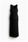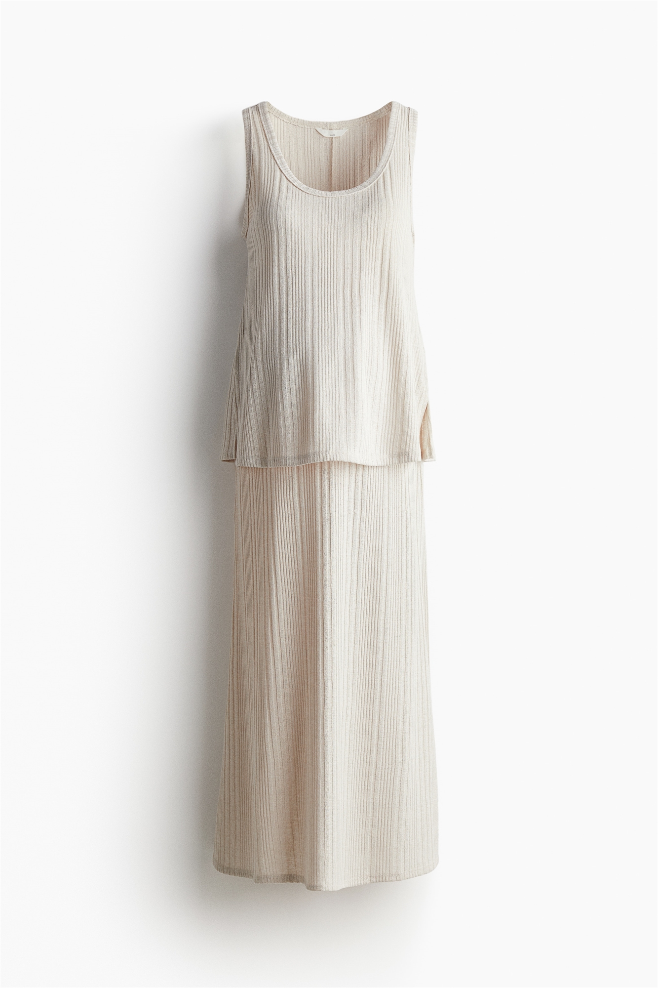 Комплект из жилета и юбки из тонкого трикотажа в рубчик. Жилет с широкими бретелями, вырезом-лодочкой и разрезом по бокам подола. Юбка длиной до колена с эластичной отделкой в верхней части и расклешенным подолом.
