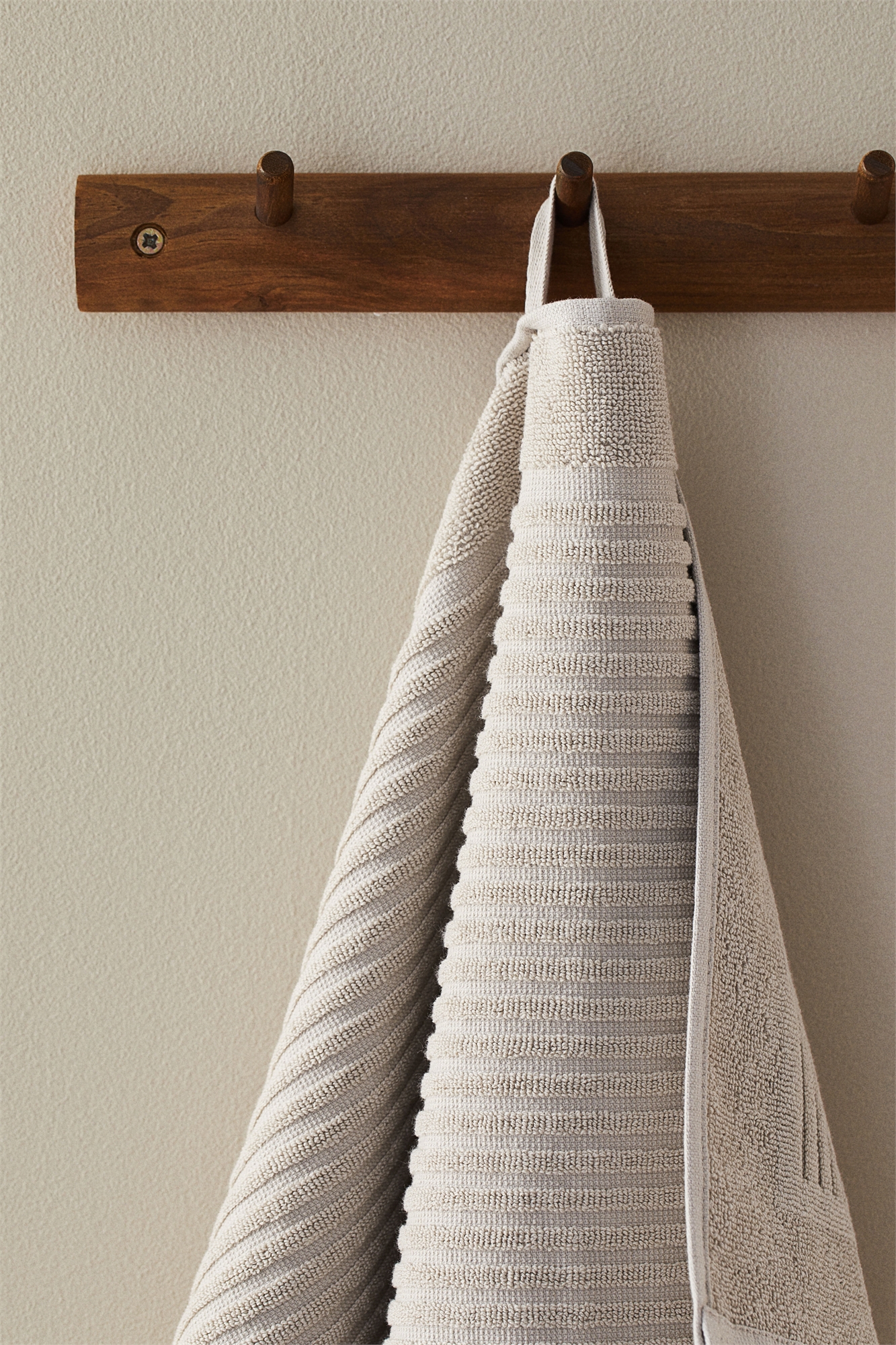 Полотенце для рук из хлопковой махры с ребристой структурой и высокой степенью впитываемости. Петля в верхней части для подвешивания. Вес: 520 GSM.