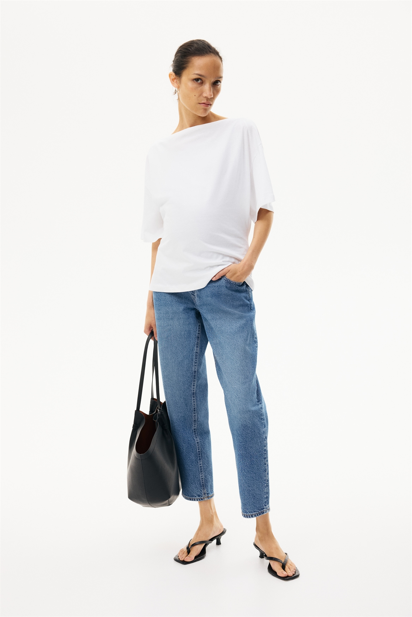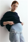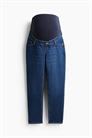 Джинсы с 5 карманами из слегка эластичного хлопкового денима с фальшивой ширинкой на пуговице, эластичными вставками по бокам и широкой панелью из джерси на талии для лучшей посадки на животе. Ноги длиной до щиколотки, сужающиеся к подолу.