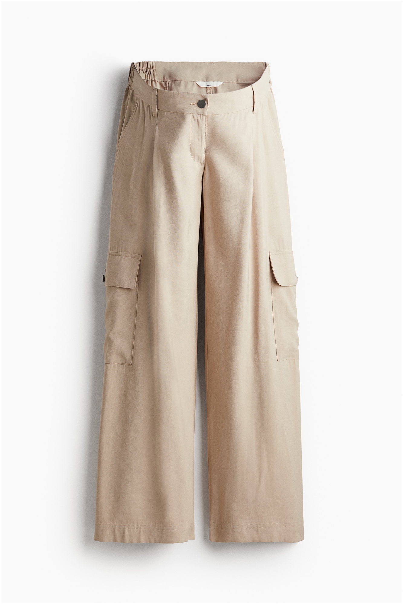 Свободные брюки из тканого материала с диагональными боковыми карманами, фальшивыми карманами с клапанами сзади и карманами на ногах с клапаном и пуговицей. Заниженная талия с ширинкой на молнии и пуговице и регулируемой резинкой в поясе, благодаря которой можно регулировать ширину талии, что позволяет носить брюки как во время, так и после беременности. Широкие ноги со складками спереди.