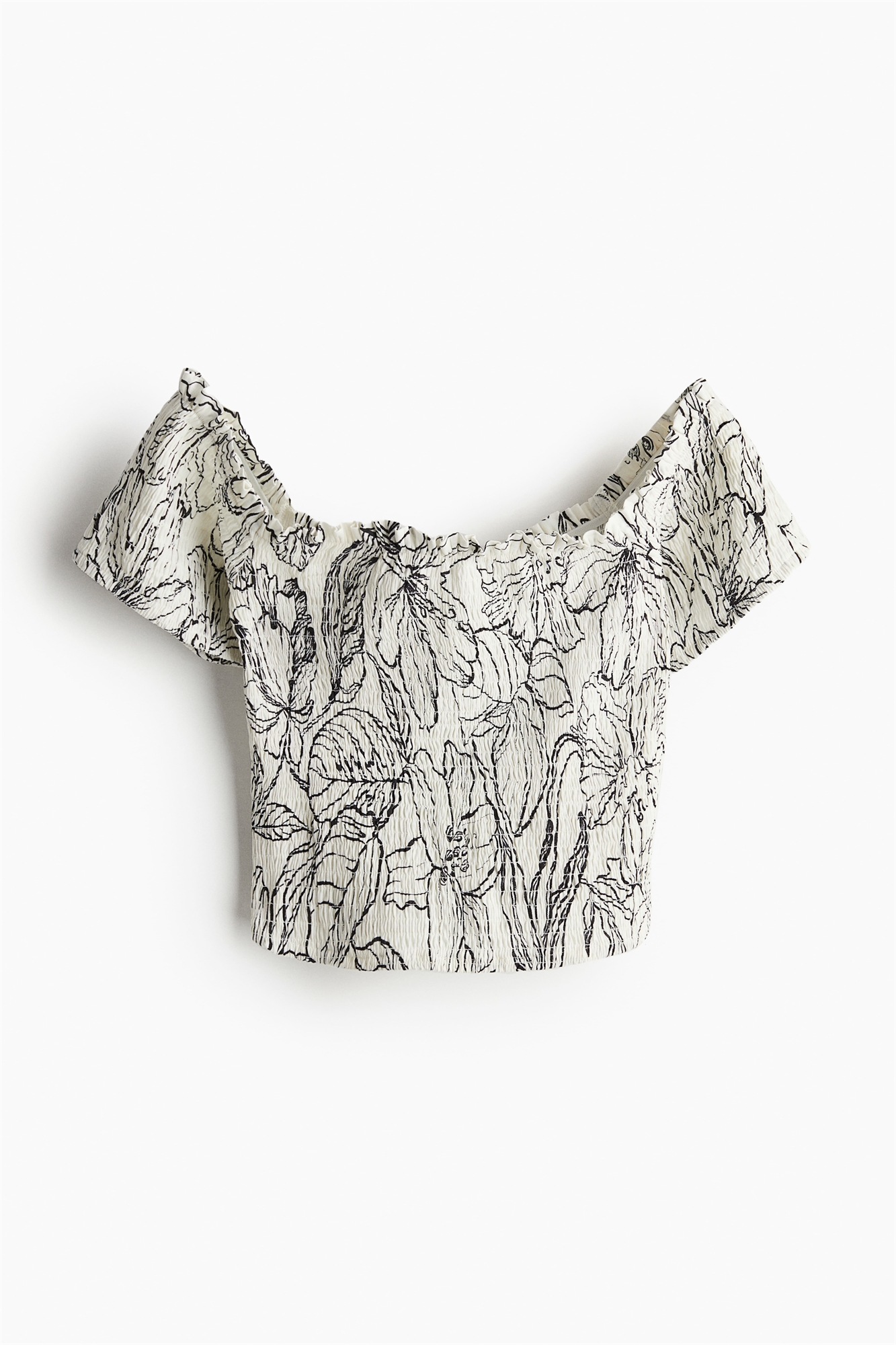 Короткий топ без плеч из льна и вискозы. Приталенный дизайн с отделкой по всему периметру, небольшая оборка по верху и короткие рукава.