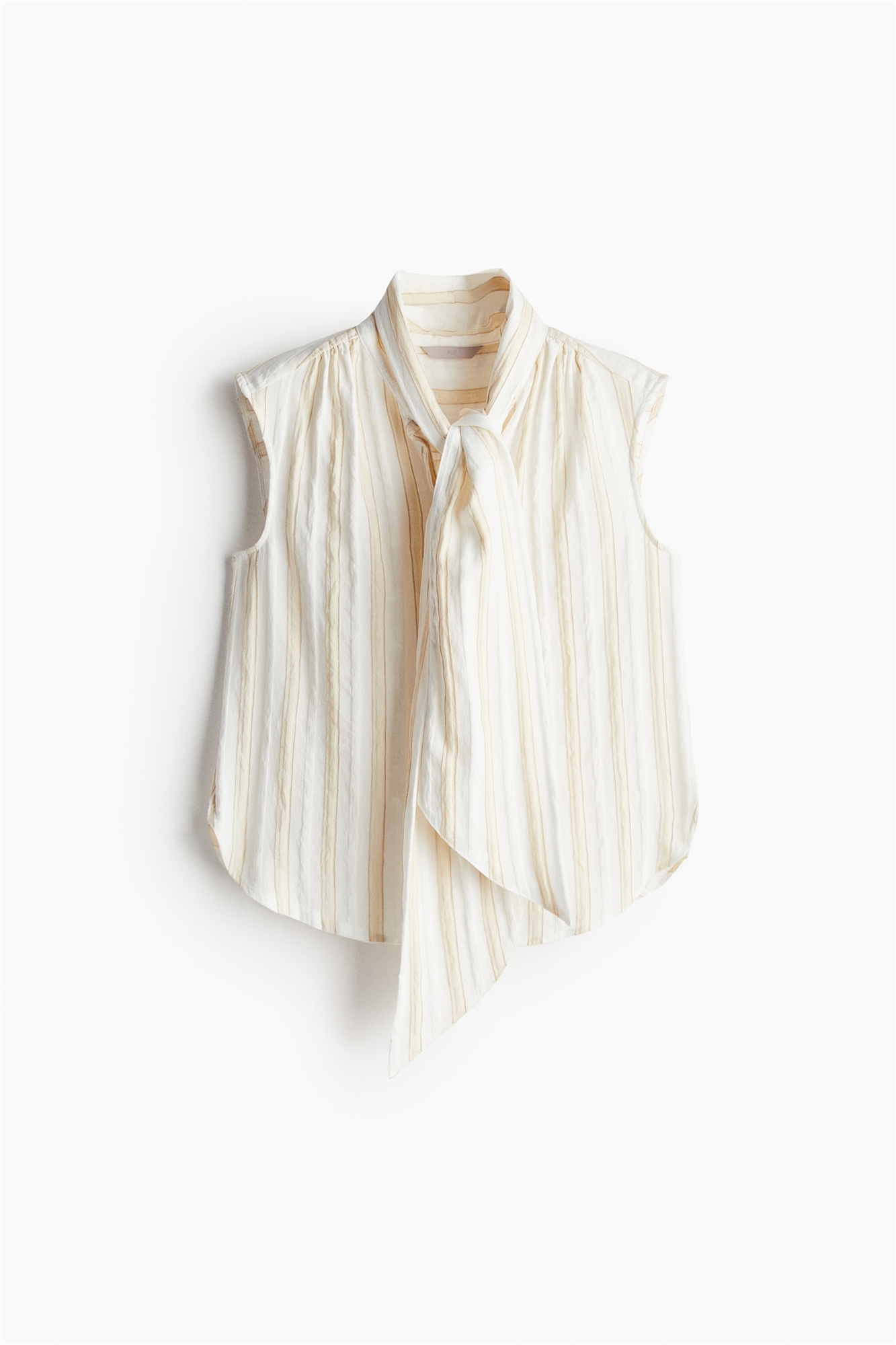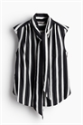 Блузка без рукавов из тканого материала с воротником и длинными широкими завязками спереди. Собранные плечевые швы, потайная застежка на пуговицах спереди и ярмо со складками сзади. Закругленный подол.