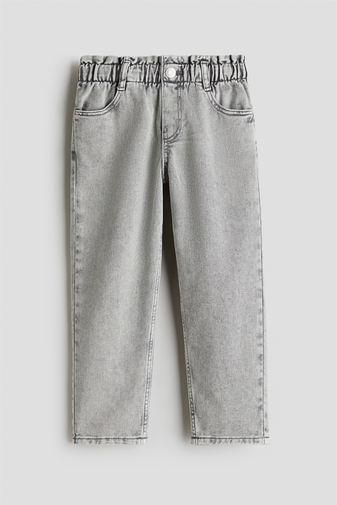 Джинсы из хлопкового денима со свободной посадкой по бедрам и ляжкам. Эластичная талия в форме бумажного мешка, фальшивая ширинка с кнопкой, диагональные боковые карманы, открытые задние карманы и слегка зауженные ноги.