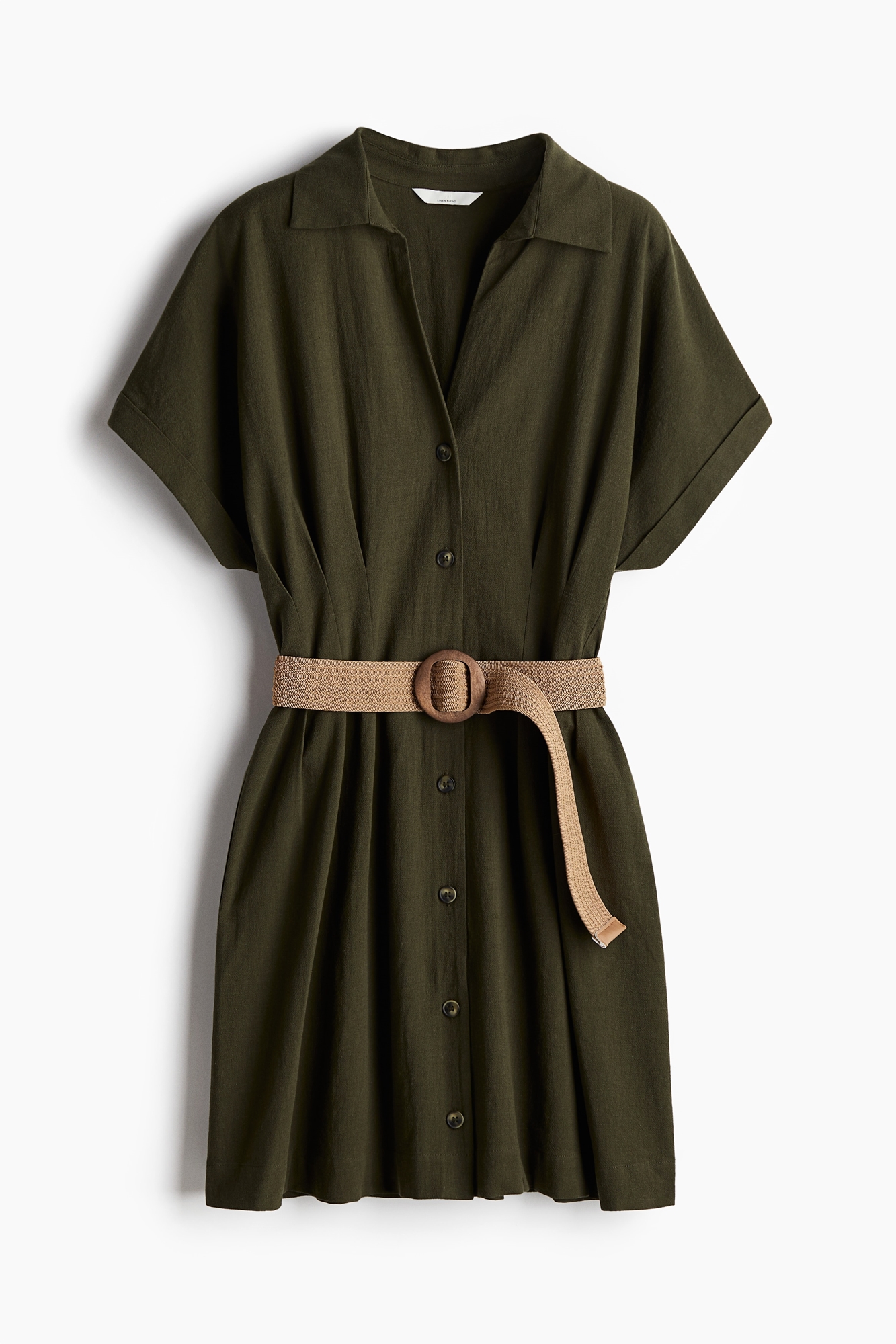 Короткое платье свободного покроя из хлопкового крепа с воротником, V-образной проймой и пуговицами спереди. Короткие рукава с отворачивающимися манжетами и плетеный пояс на талии с круглой деревянной пряжкой. Складки спереди и сзади для придания силуэту привлекательности. Без отделки.