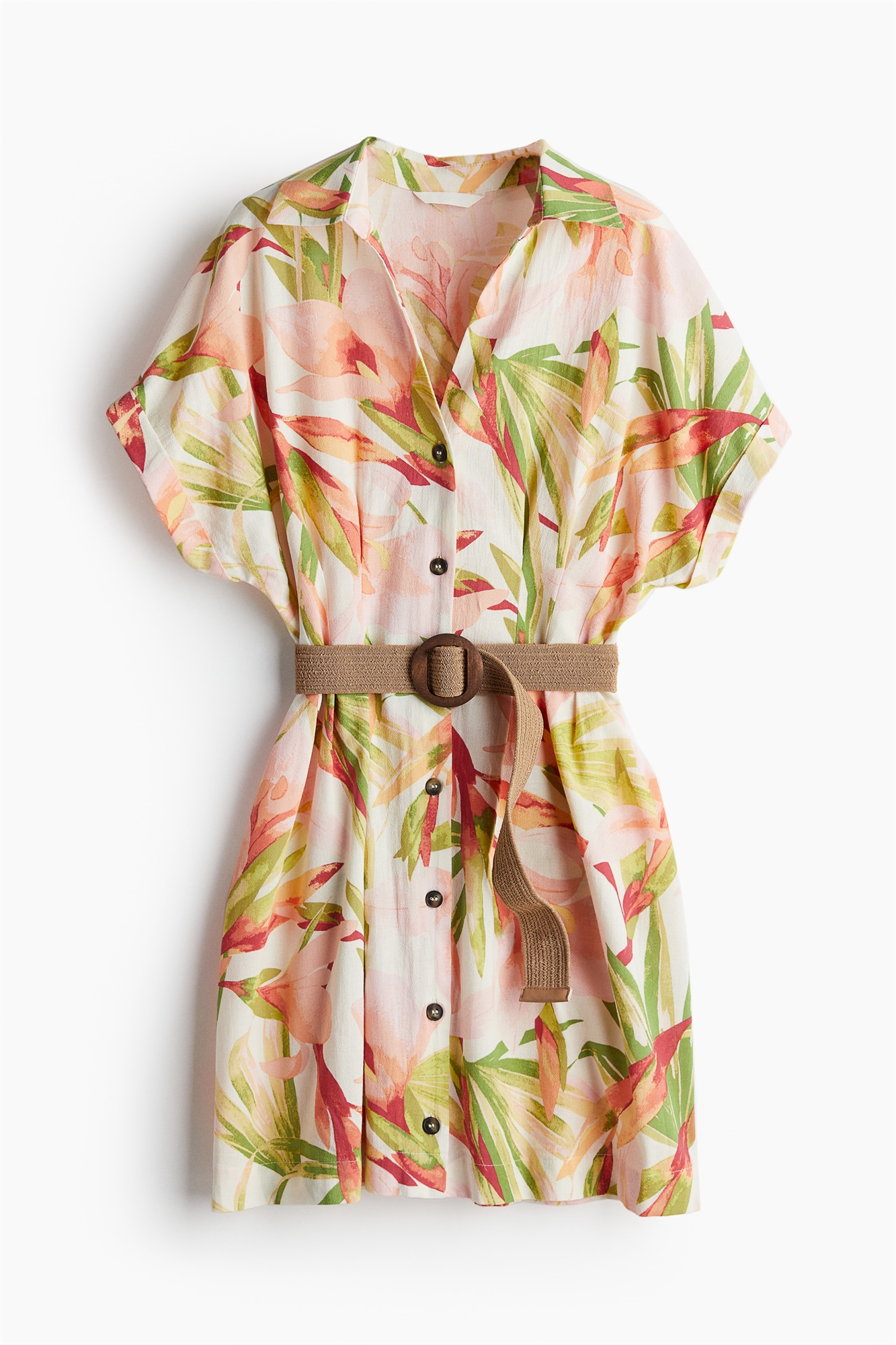 Короткое платье свободного покроя из хлопкового крепа с воротником, V-образной проймой и пуговицами спереди. Короткие рукава с отворачивающимися манжетами и плетеный пояс на талии с круглой деревянной пряжкой. Складки спереди и сзади для придания силуэту привлекательности. Без отделки.