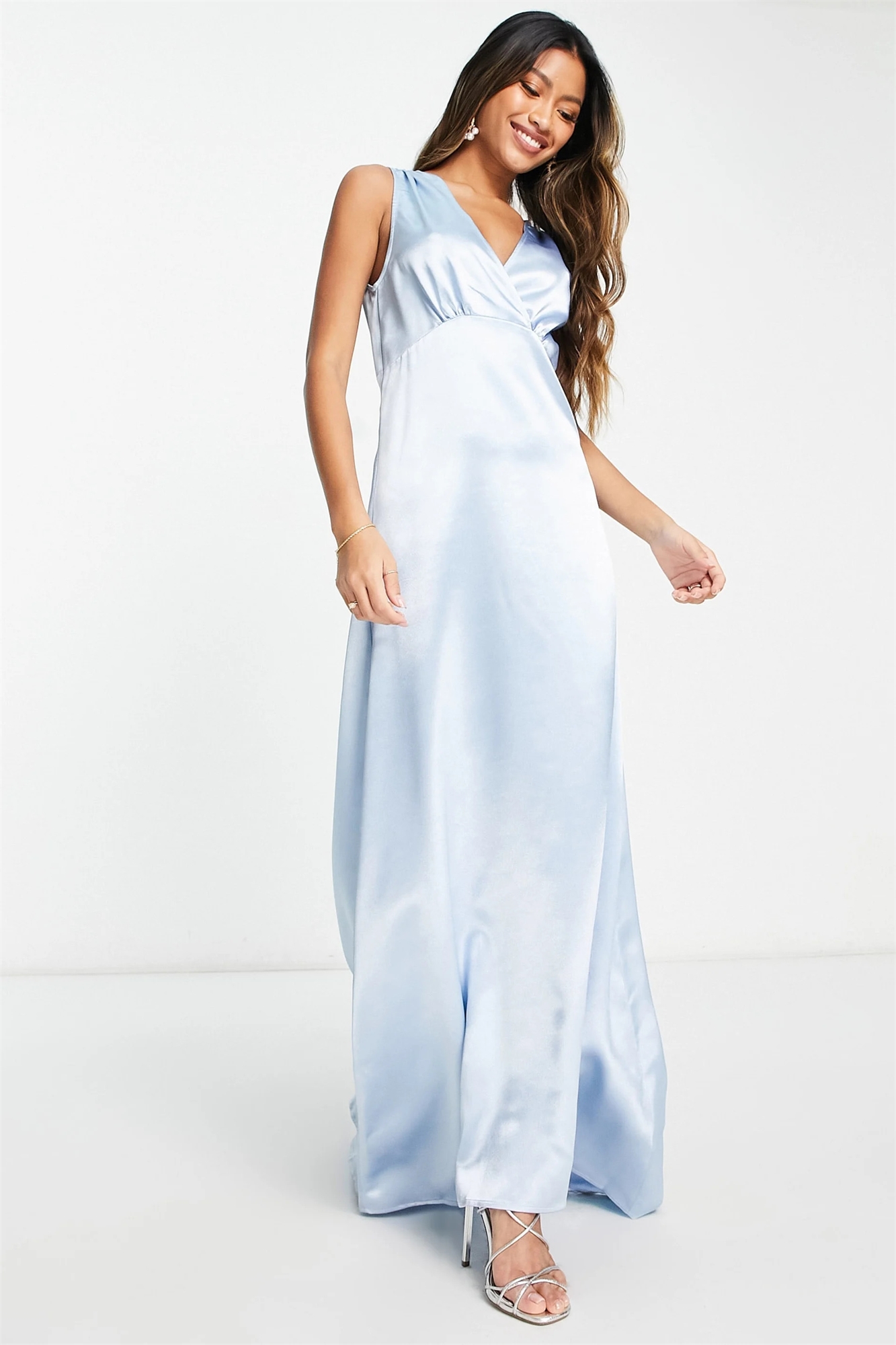 Атласное макси-платье с V-образным вырезом и шлейфом для подружки невесты