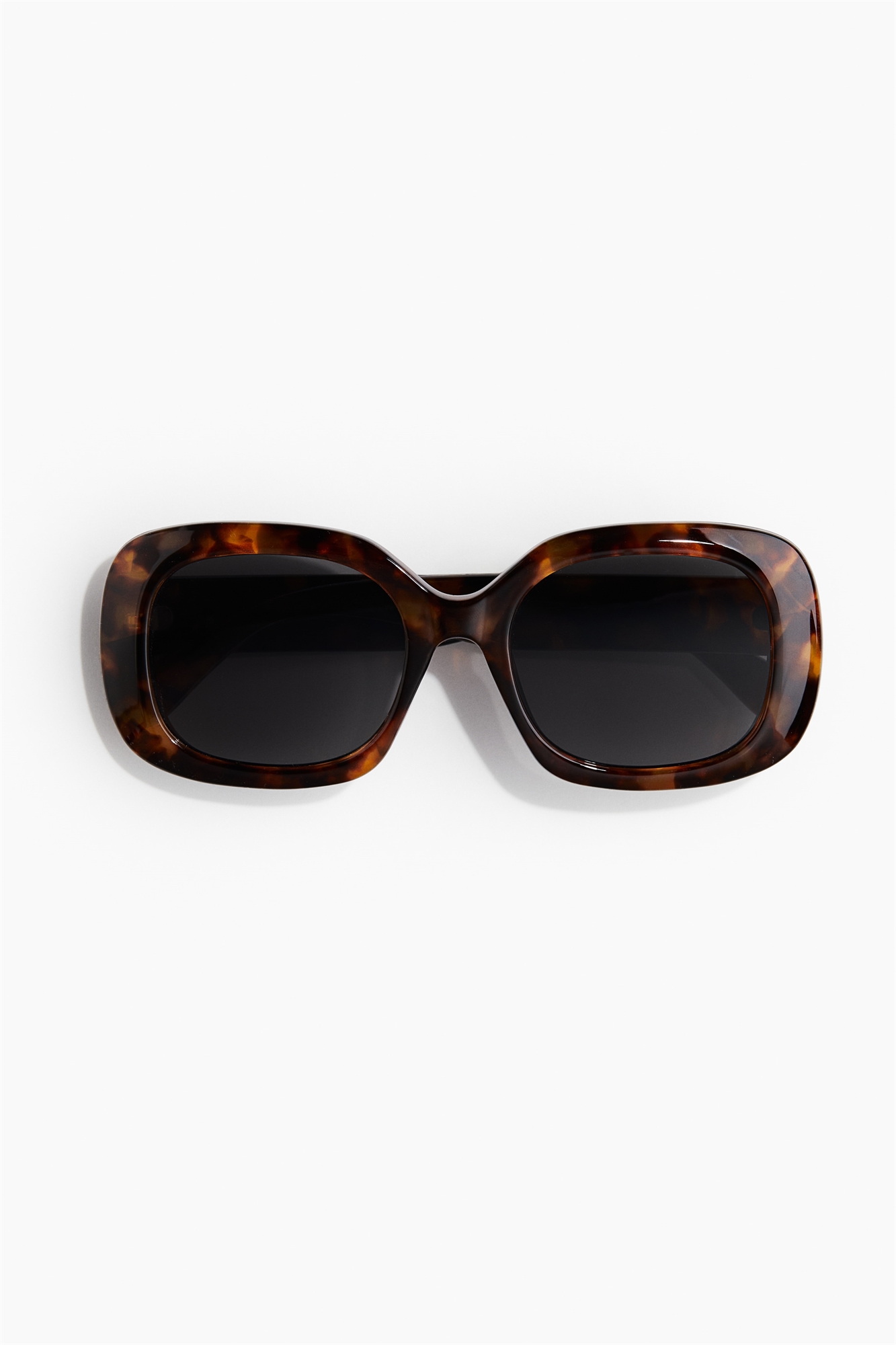 Квадратные солнцезащитные очки с пластиковой оправой и боковыми дужками. Тонированные пластиковые линзы с УФ-защитой.