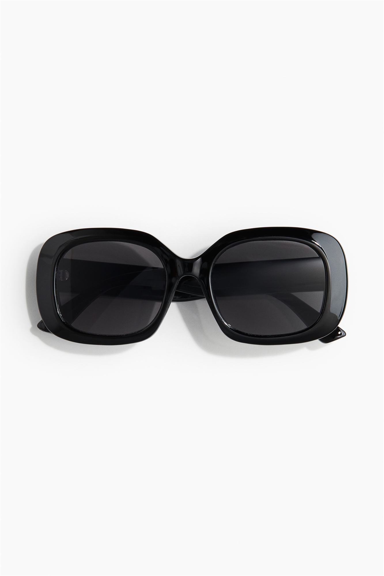 Квадратные солнцезащитные очки с пластиковой оправой и боковыми дужками. Тонированные пластиковые линзы с УФ-защитой.