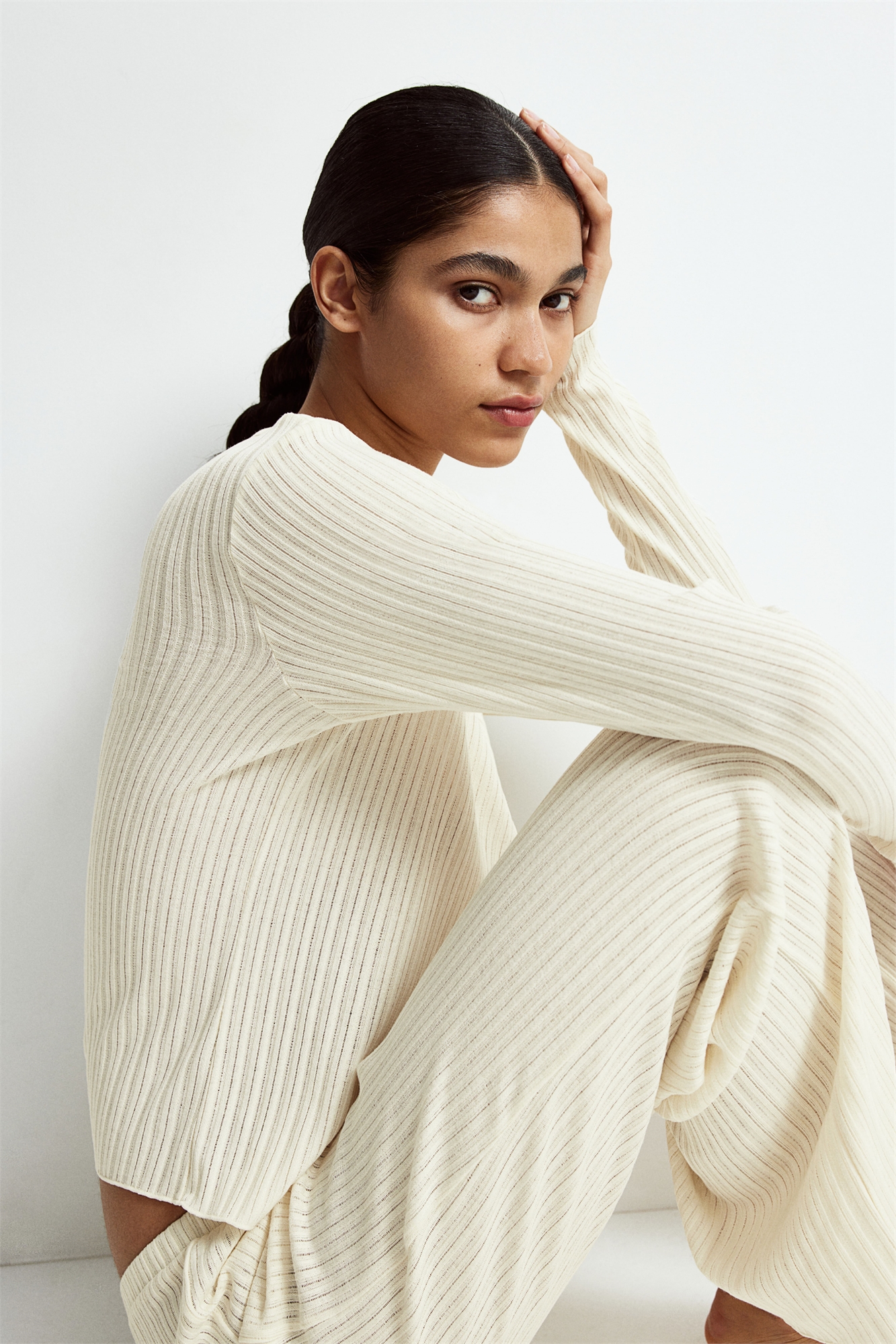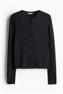 Приталенный кардиган из тонкого трикотажа в рубчик с круглым вырезом и застежками на кнопках спереди. Длинные рукава, манжеты и подол обработаны оверлоком.