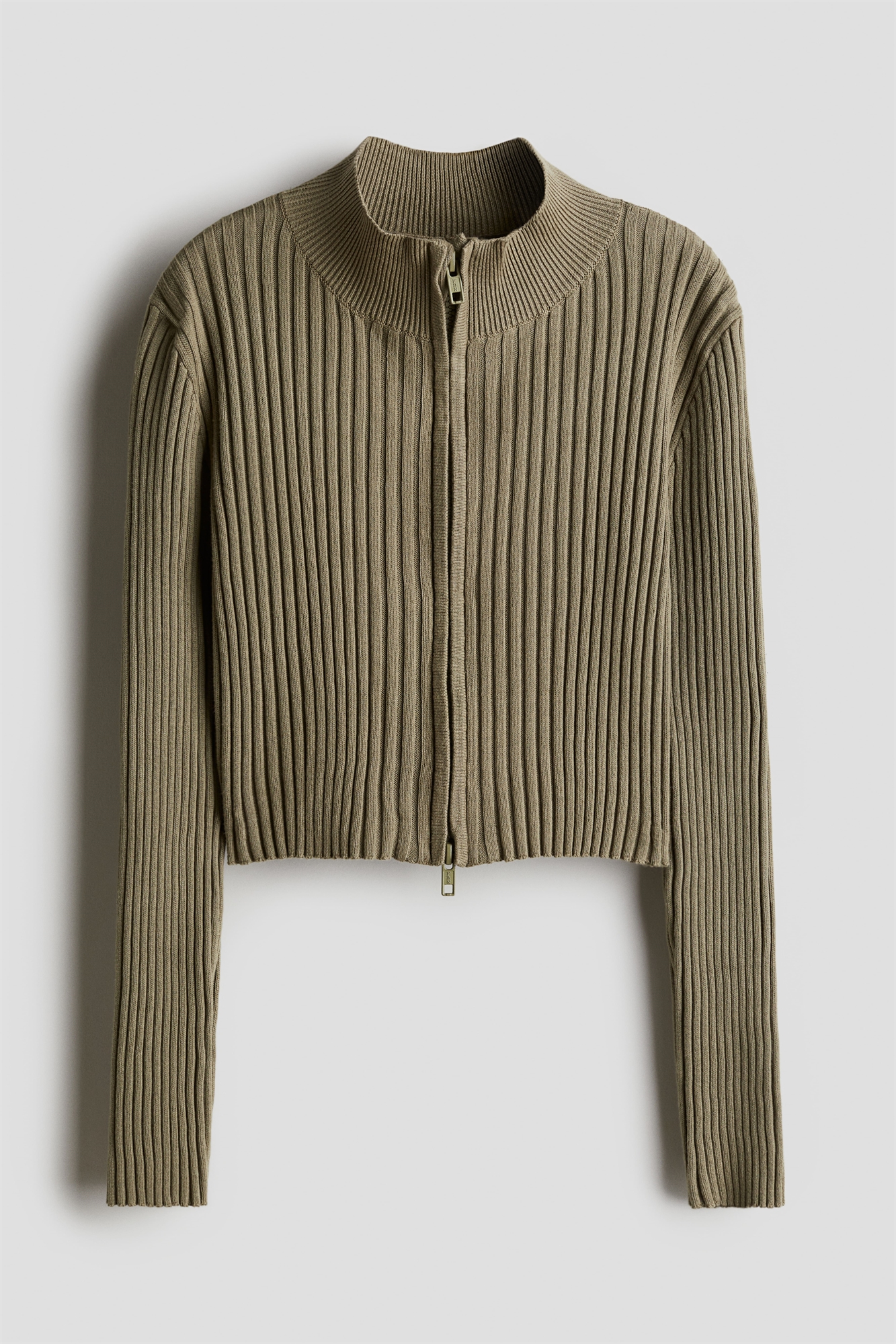 Кардиган из хлопка ребристой вязки с черепаховой горловиной, двусторонней застежкой-молнией спереди и длинными рукавами.