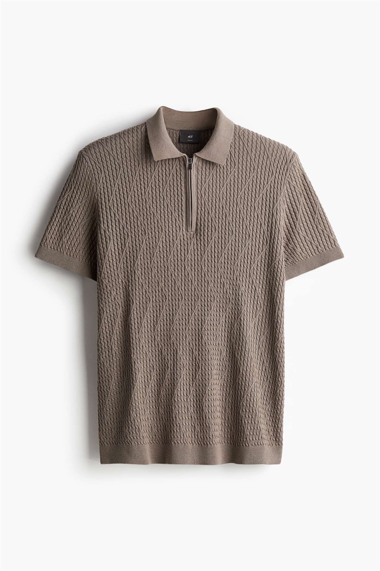 Рубашка-поло с короткими рукавами из мягкого трикотажа в рубчик из смеси хлопка и вискозы. Воротник, застежка-молния сверху и прямой подол. Зауженный крой, облегающий контуры тела и создающий приталенный силуэт.