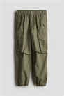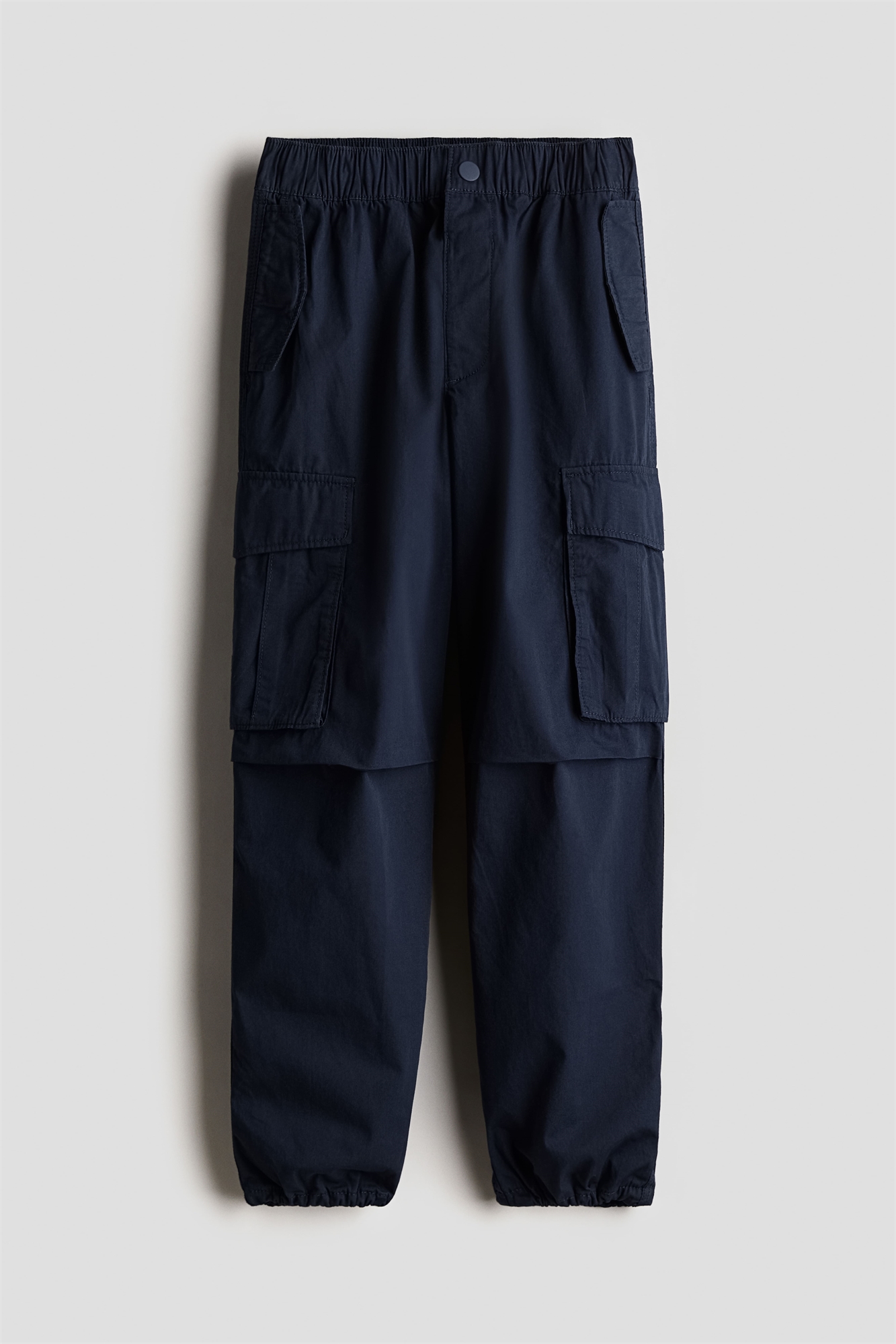 Брюки из хлопкового полотна с накладными карманами на ногах. Свободный крой с эластичным поясом, фальшивой ширинкой и кнопкой, а также накладными передними карманами с потайной кнопкой. Складки на коленях для придания дополнительной ширины и прямые ноги с эластичным шнурком на подоле.