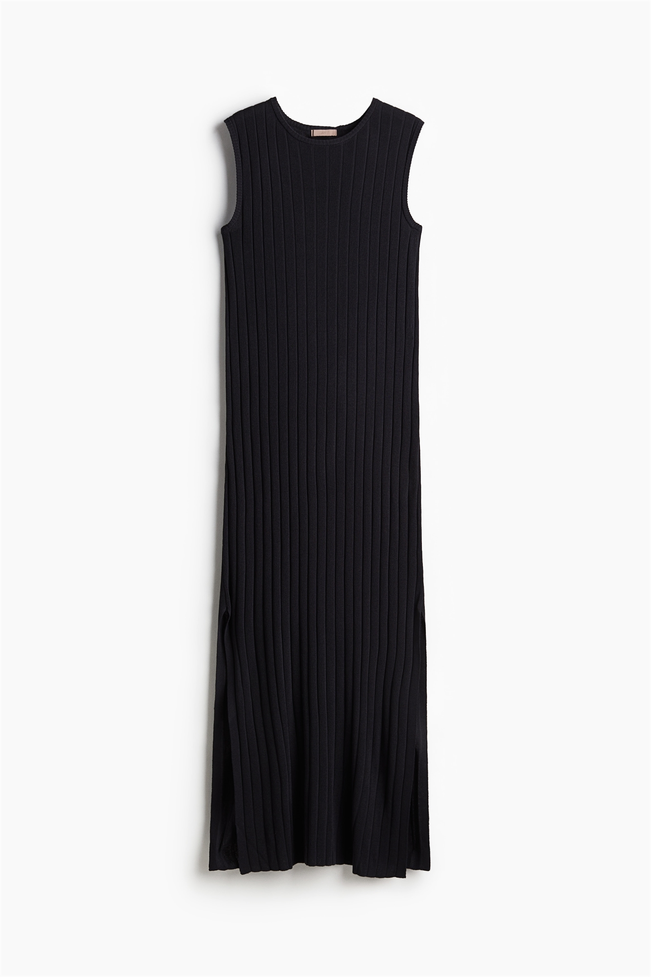 Платье без рукавов длиной до колен из мягкого трикотажа в рубчик с круглым вырезом и высоким разрезом по бокам подола.