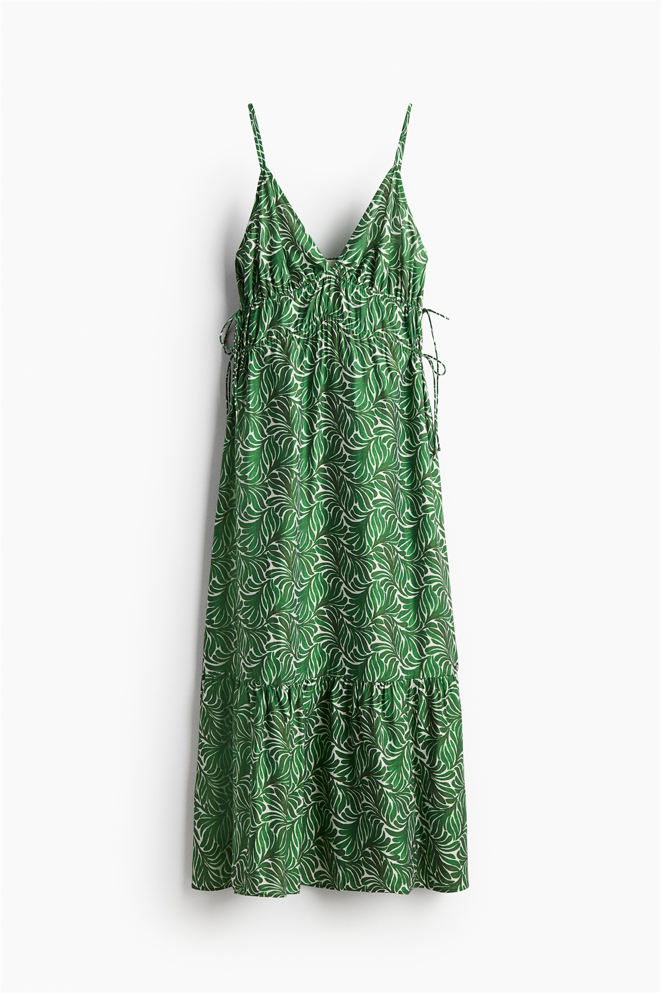 Длинное платье из тканого материала с узкими регулируемыми бретелями. Глубокий V-образный вырез и двойные завязки-спагетти под бюстом, которые завязываются по бокам. Расклешенная юбка со сборками. Без подкладки.