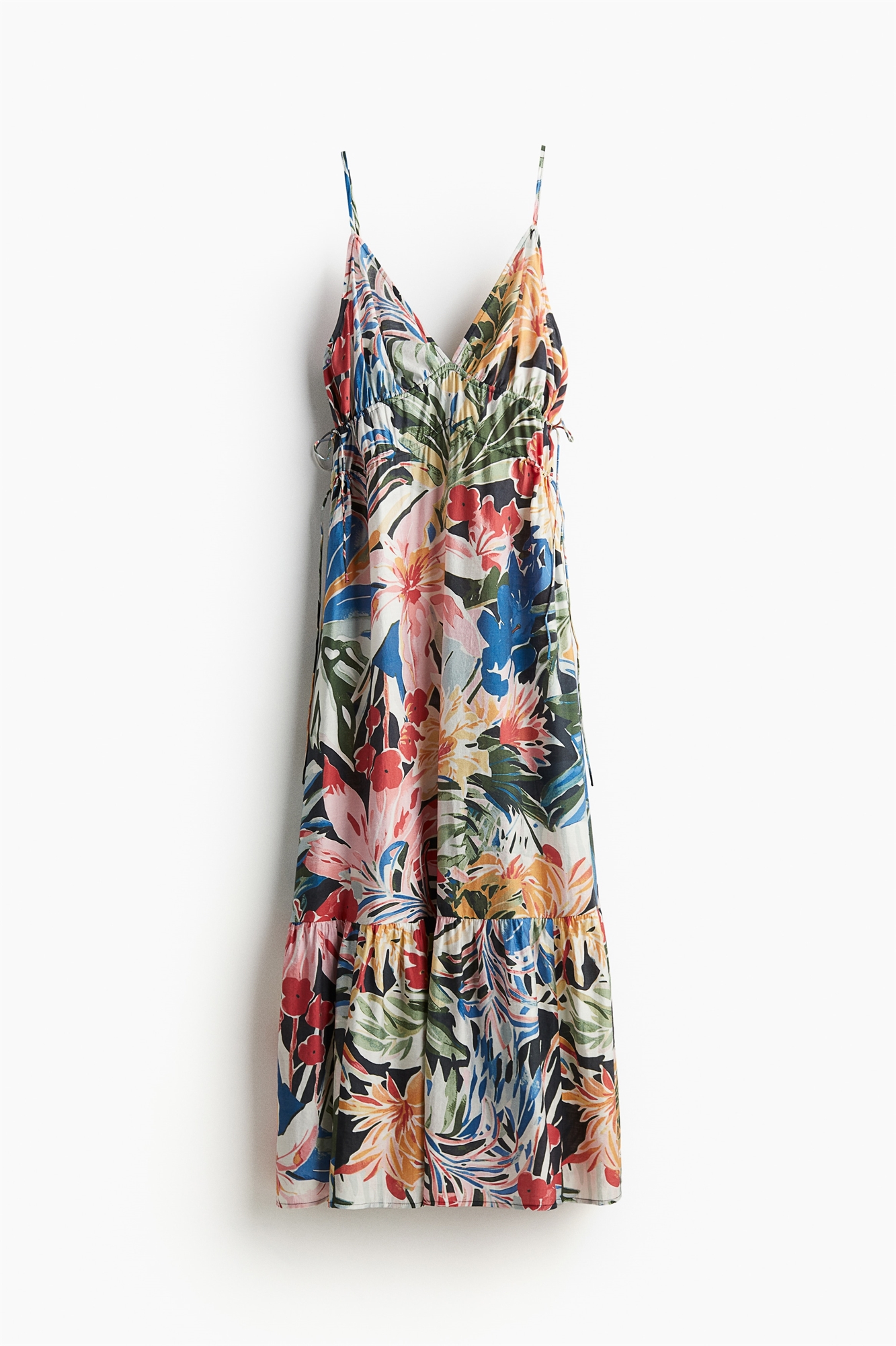 Длинное платье из тканого материала с узкими регулируемыми бретелями. Глубокий V-образный вырез и двойные завязки-спагетти под бюстом, которые завязываются по бокам. Расклешенная юбка со сборками. Без подкладки.