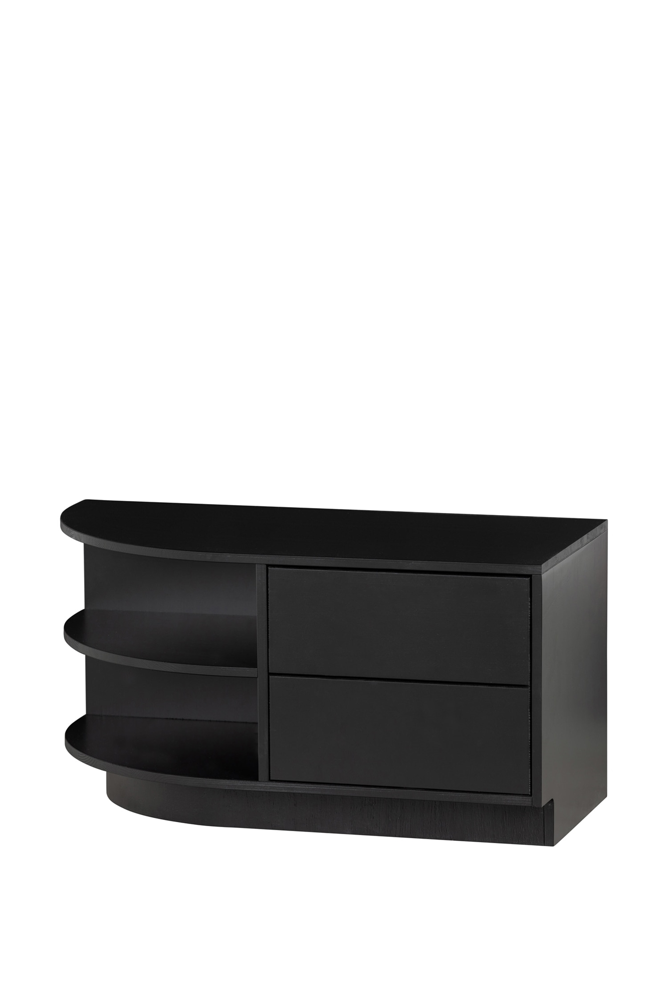Стильная, вневременная и современная. Это ключевые слова серии Finca. Серия Finca входит в коллекцию голландского мебельного бренда WOOOD и выполнена из натуральной древесины сосны. Предметы серии Finca имеют матовое покрытие глубокого черного цвета. Чистые линии мебели Finca не прерываются ручками; современная система push-to-open позволяет дверцам и ящикам открываться и закрываться бесшумно. Тумба под телевизор Finca с круглым элементом - настоящий шедевр в гостиной. Два выдвижных ящика обеспечивают дополнительное вместительное пространство для хранения, которое не видно. Нижний край тумбы для телевизора оставляет 7 см свободного пространства спереди, благодаря чему тумба кажется парящей. В 40 см x Ш 78 см x Г 40 см.