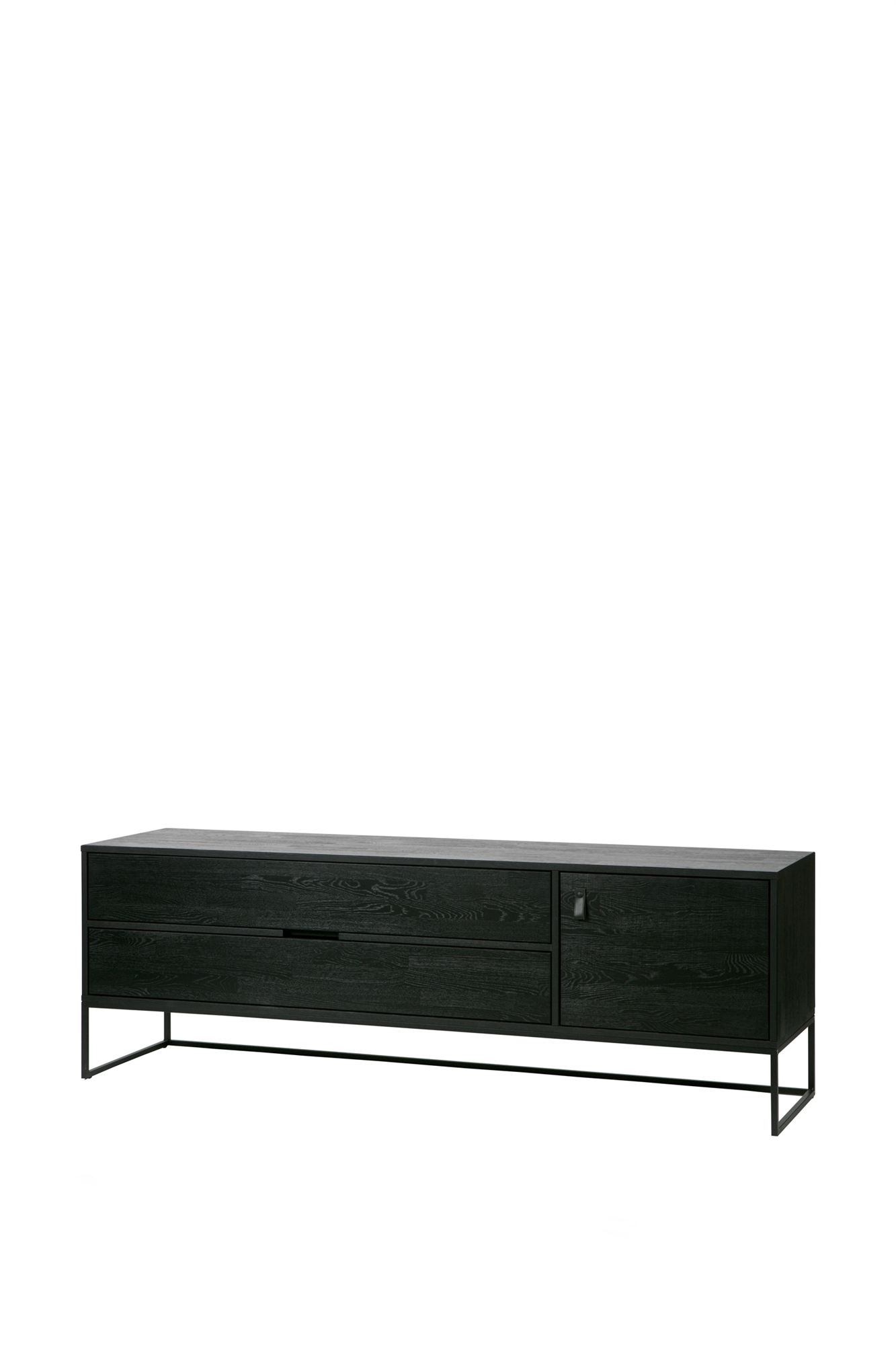 Тумба для телевизора Silas изготовлена из черного ясеня, сертифицированного FSC, и входит в коллекцию голландского бренда WOOOD. Этот предмет мебели изготовлен из древесины ясеня (с пальцевым соединением), отшлифован и покрыт лаком цвета blacknight. Ясень - слегка мягкая древесина с плотной, прямой текстурой. Высота тумбы для телевизора Silas составляет 60,5 см, ширина - 180 см, глубина - 44 см. Два выдвижных ящика имеют ширину 121 см и высоту 13 см. Тумба с правой стороны имеет полку (из ДСП) и закрывается дверцей, HxW 37x50,1 см с кожей.