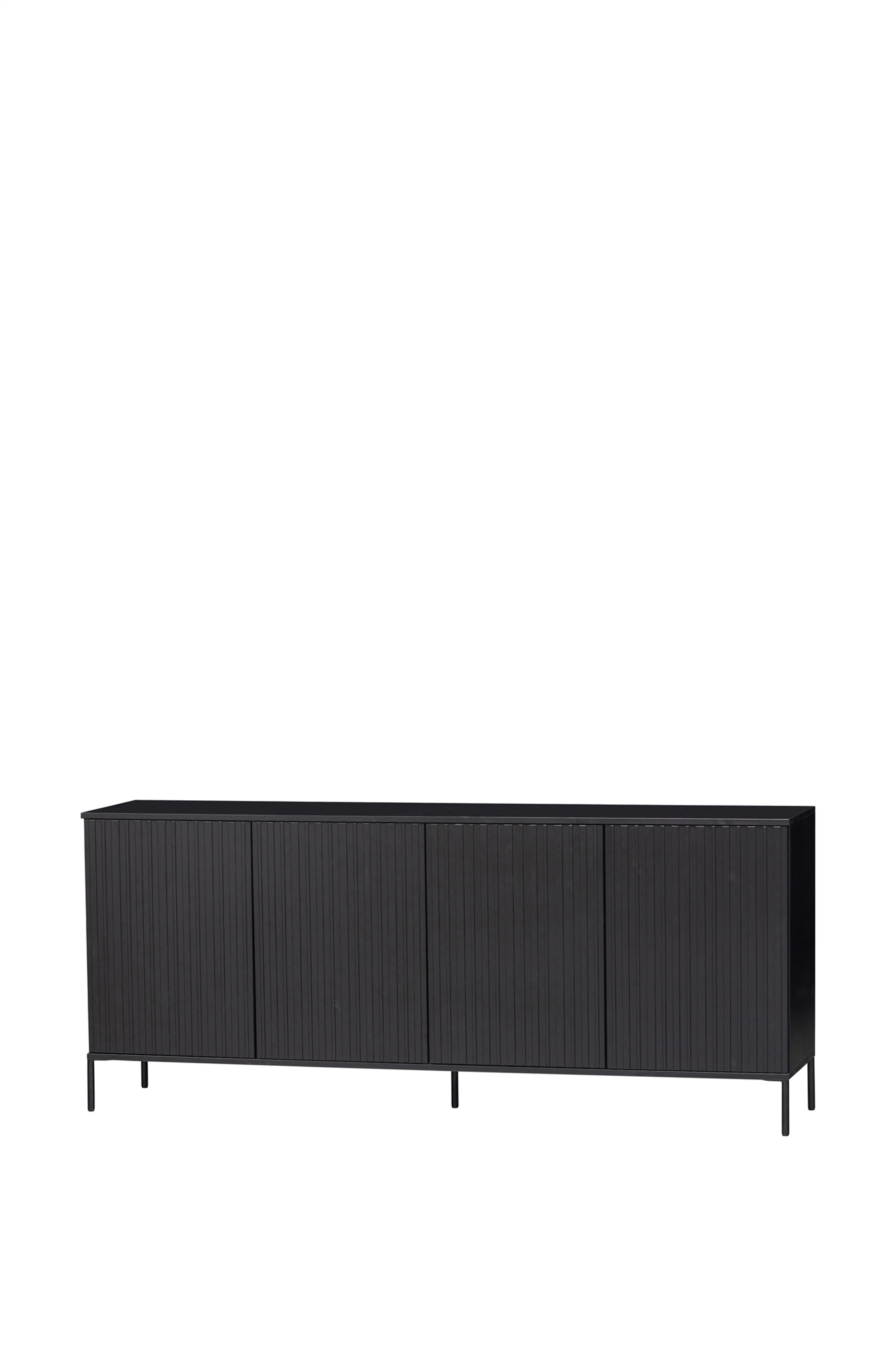 Наша успешная серия Gravure в новом цвете! Комод New Gravure изготовлен из древесины сосны и покрыт глубокой черной морилкой. Внутренняя отделка выполнена из черного ДСП. Ножки выполнены из металла с черным покрытием. Высота серванта New Gravure составляет 85 см, ширина - 200 см, глубина - 44 см. Четыре дверцы имеют высоту 66 см, ширину 50 см и толщину 2 см. Линейный рисунок на фасадах дверей без ручек придает серванту Gravure привлекательный и узнаваемый вид. Полки образуют восемь отделений размером 32,5 x 47,5 x 41 см (высота x ширина x глубина), что обеспечивает достаточно места для хранения.