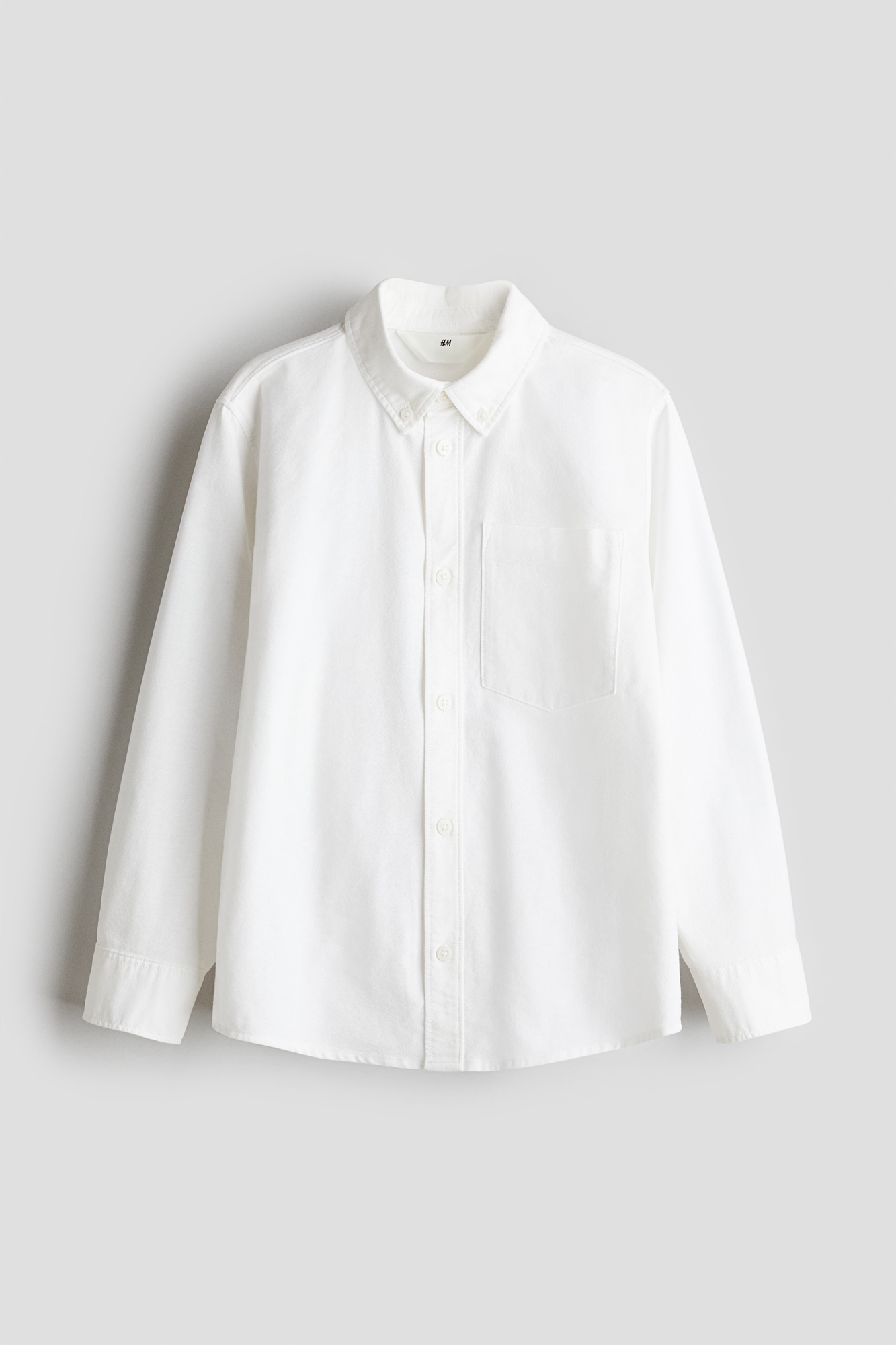 Рубашка из мягкого хлопкового полотна с отложным воротником на пуговицах. Пуговицы спереди и на манжетах, а также открытый нагрудный карман. Слегка закругленный подол.
