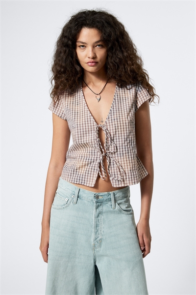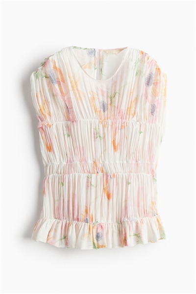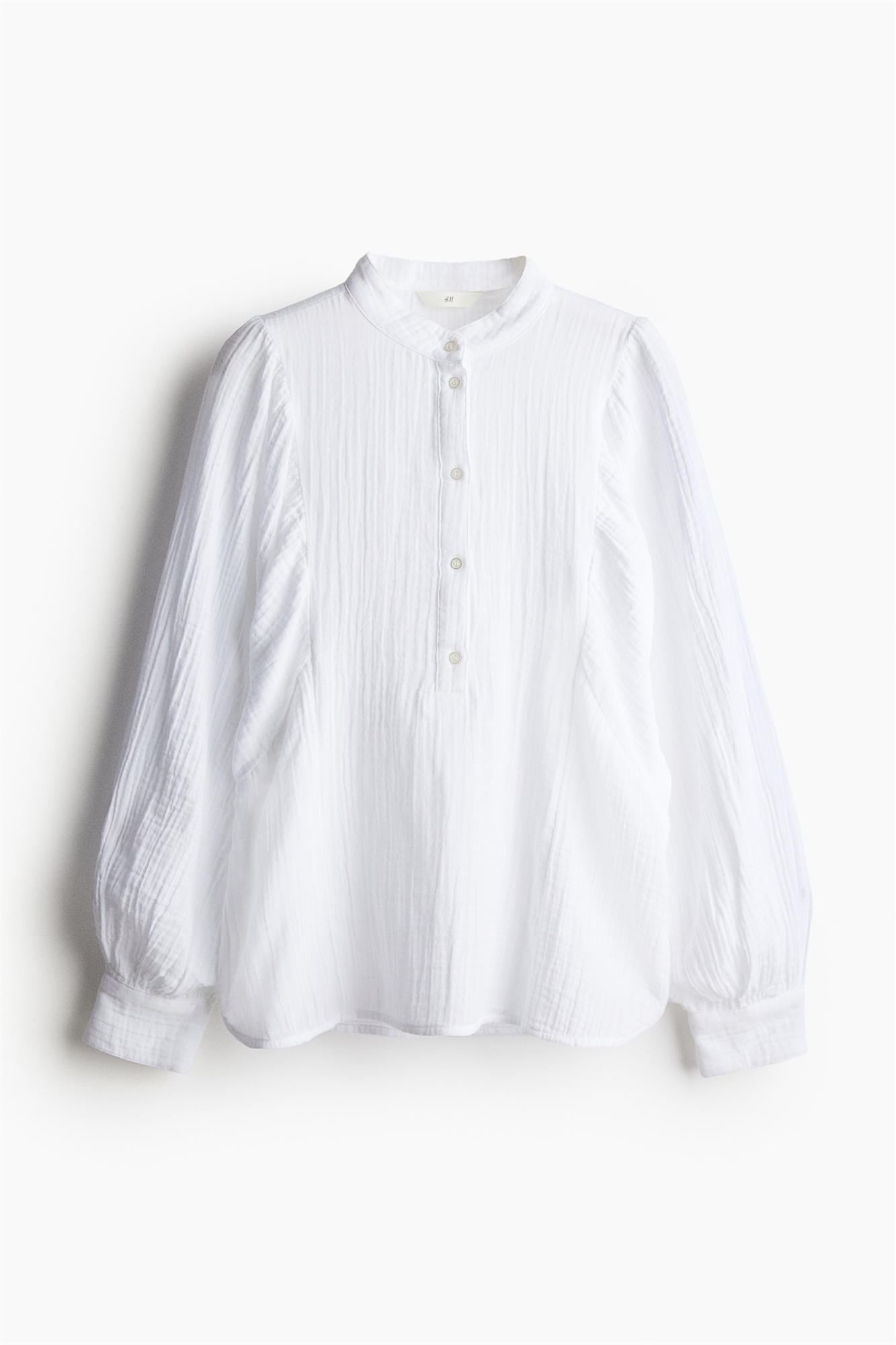 Свободная блузка из мягкого хлопкового муслина с небольшим воротником-стойкой и застежкой на пуговицы спереди. Длинные рукава-бабочки со сборками на плечах и манжетами на пуговицах. Аккуратный закругленный подол.