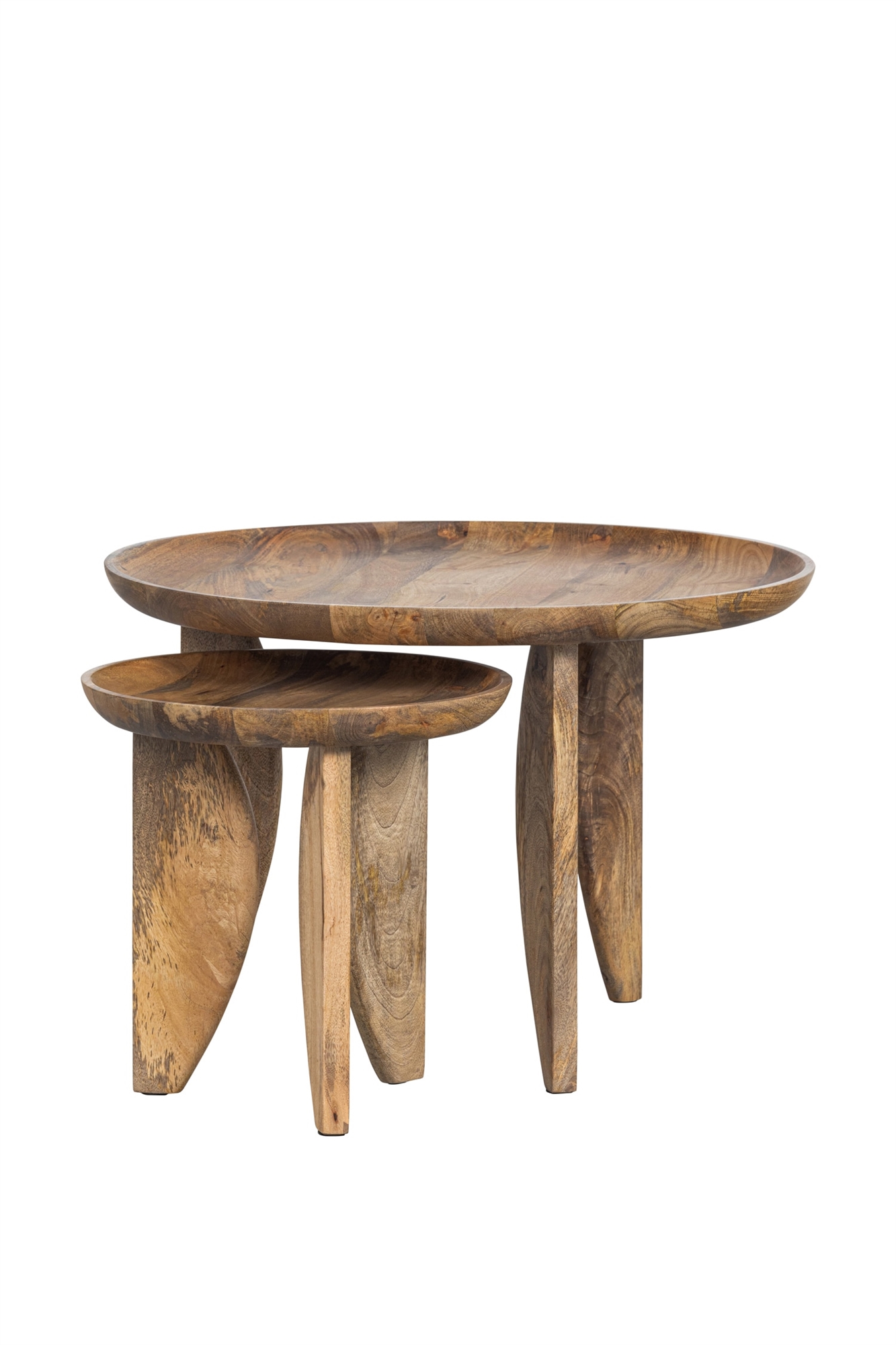 Удивительная и в то же время утонченная, стройная и дружелюбная форма. Столики изготовлены из древесины манго с нейтральным покрытием, которое раскрывает свойства натурального материала. Древесина манго известна своим теплым золотисто-коричневым цветом, устойчивостью роста и долговечностью. Древесина манго также характеризуется четко выраженными зернами и цветовыми нюансами. Маленькая версия имеет высоту 40 см и может быть частично помещена под большую версию для создания игривой комбинации. Диаметр столешницы составляет 40 см. Большая версия имеет высоту 47 см и диаметр 70 см. H 40 см x Ø 40 см / H 47 x Ø 70 см.