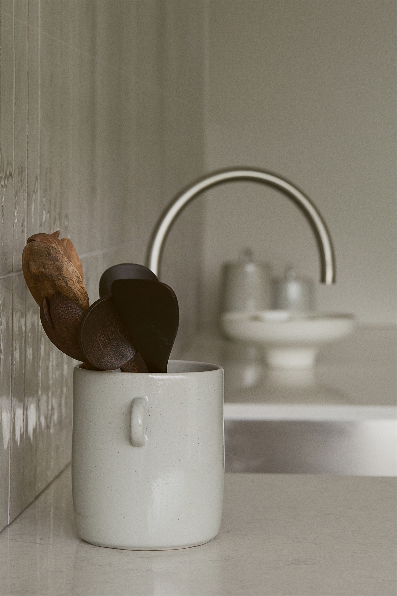 Подставка для посуды из глазурованной керамики с двумя ручками. Диаметр 15,5 см. Высота 16,8 см.
