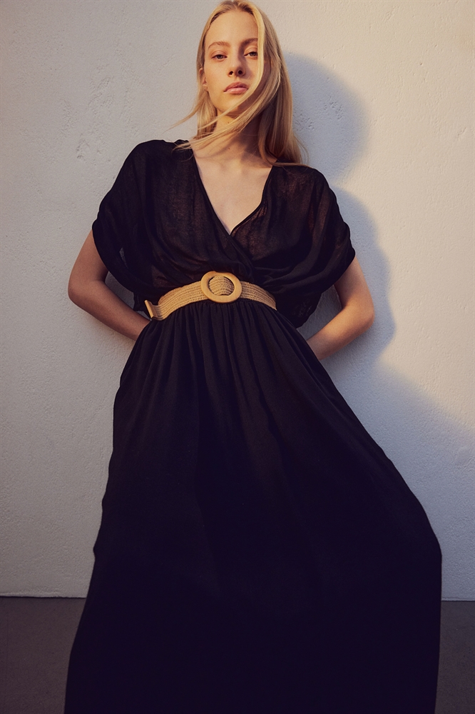 Платье длиной до колен без рукавов из воздушной вискозы. Свободный крой с V-образным вырезом горловины и облегающим верхом с потайной застежкой на крючки и глазки. Широкий эластичный пояс на талии с круглой деревянной пряжкой. Юбка на подкладке.