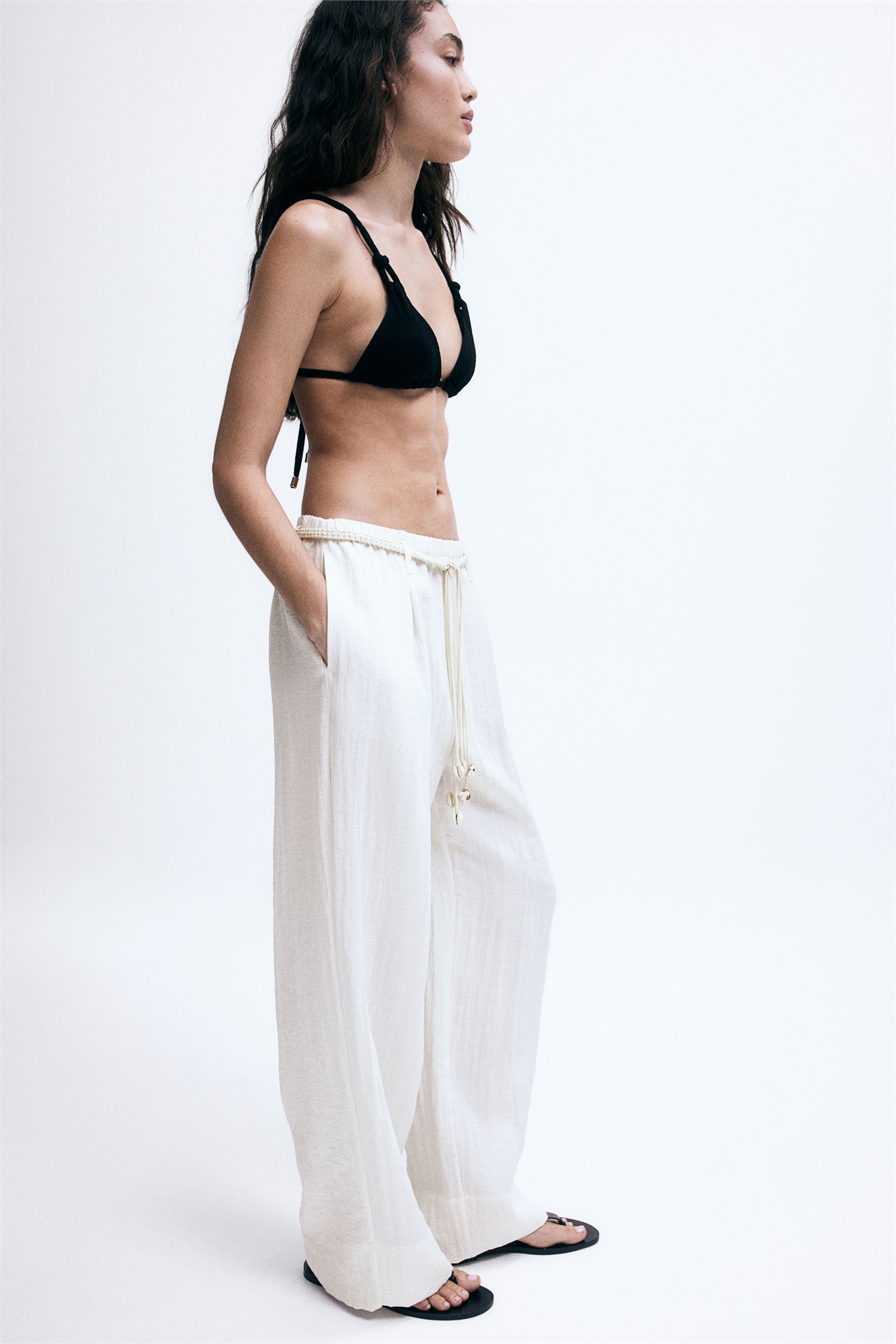 Свободные брюки из крепового полотна с высокой эластичной талией, неброскими боковыми карманами и широкими ногами со складками в верхней части. Съемный пояс с завязками макраме.
