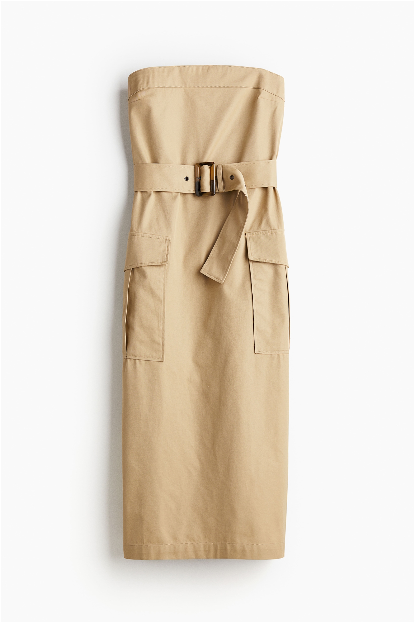 Приталенное платье-бандо длиной до колен из хлопковой саржи с потайной застежкой-молнией с одной стороны и эластичной вставкой сзади. Широкий съемный пояс на талии, большие накладные карманы по бокам и один вентиляционный канал сзади. Без подкладки.