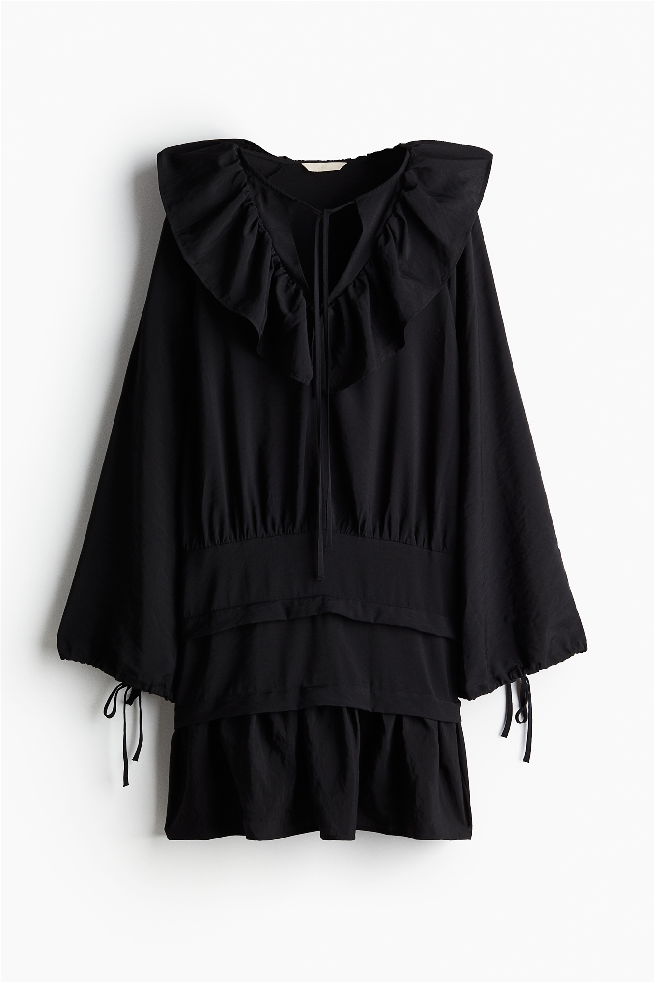 Короткое платье из тканого материала из смеси модала. Широкий воротник с оборками и V-образная пройма с узкими завязками спереди. Длинные рукава-баллоны покроя реглан с разрезом и узким шнурком на манжетах. Присборенный шов на бедрах и юбка с горизонтальными складками и расклешенным подолом. Потайная застежка-молния с одной стороны. Без подкладки.